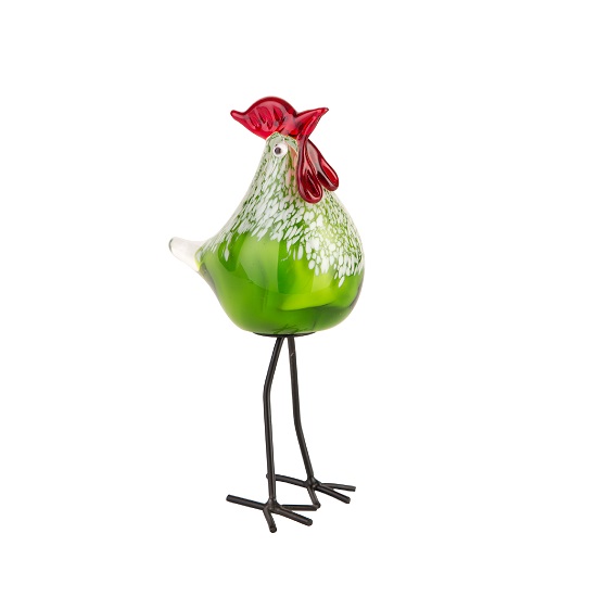 [0] => The Green Hen sculpture is made of glass with metal legs and features a bright green body with white and red details. Its round body is juxtaposed against its slim legs, and its bright, cheerful appearance will bring a charming accent to any room.