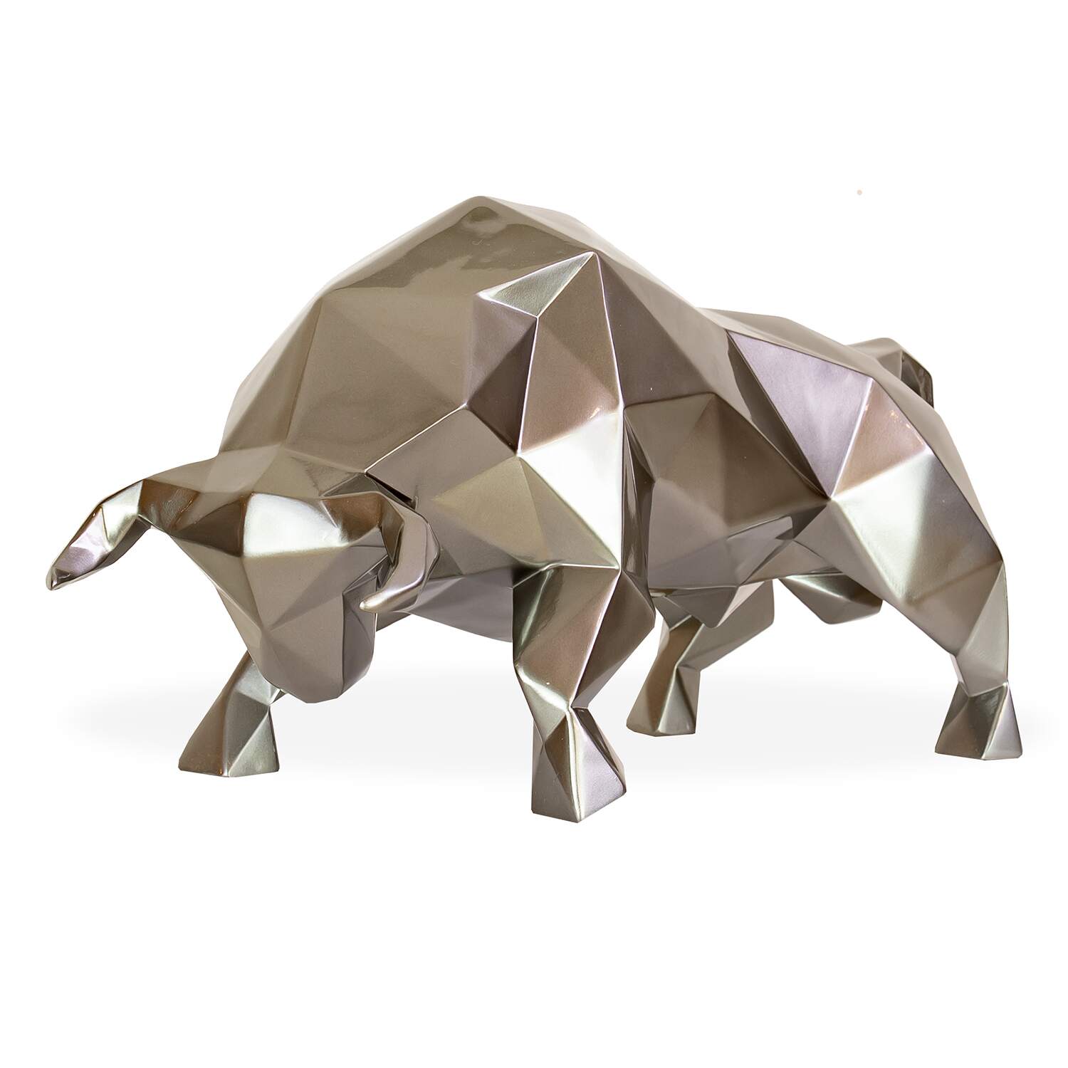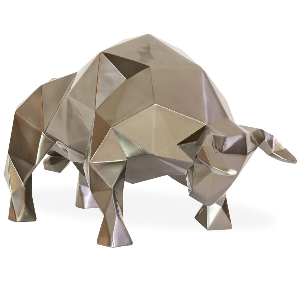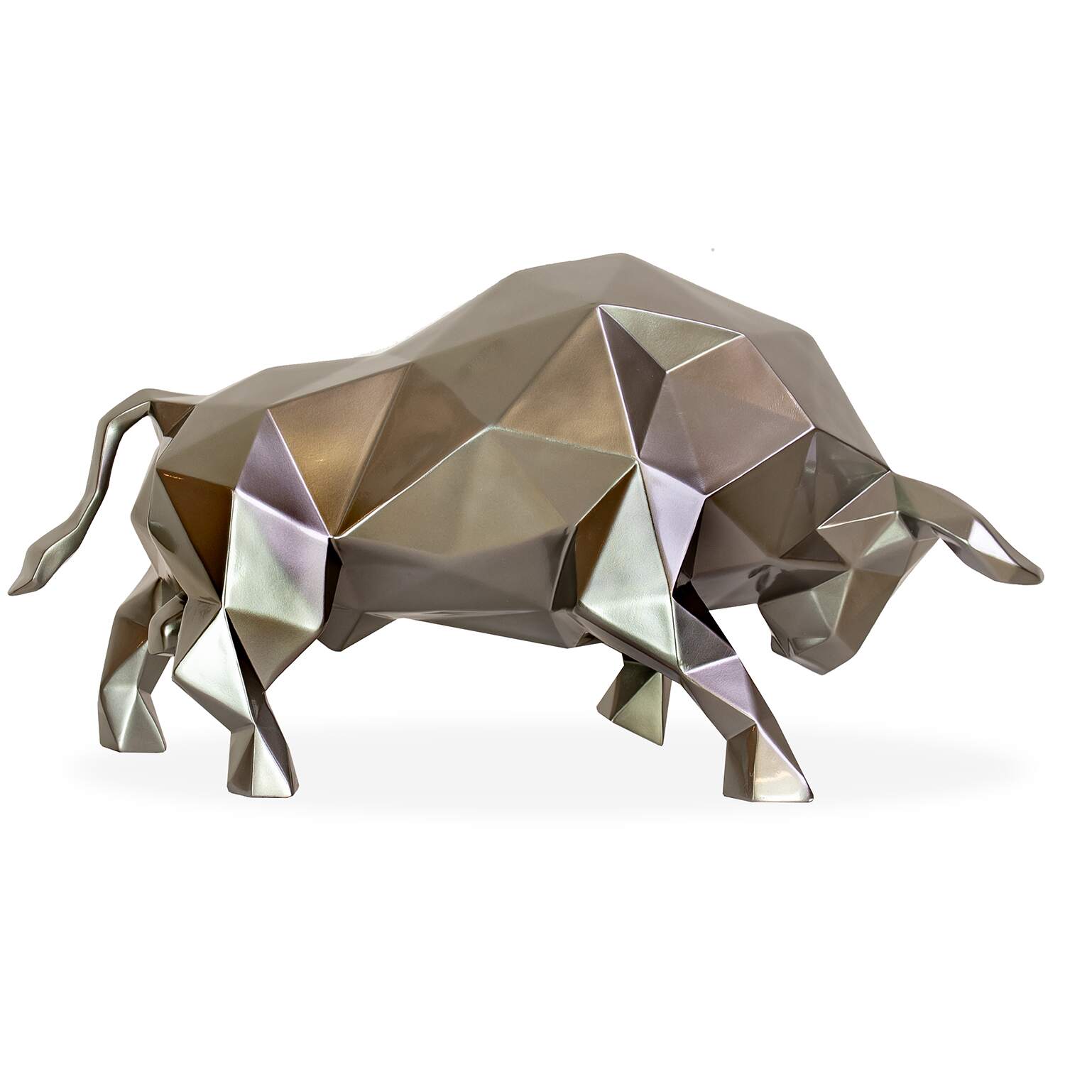 The Grey Bull Sculpture has a glossy grey finish and stands in an active pose with its horns lowered and its back arched. Grey Bull features a stylized form with its body rendered in geometric facets, making it a bold choice for modern and contemporary decor schemes.