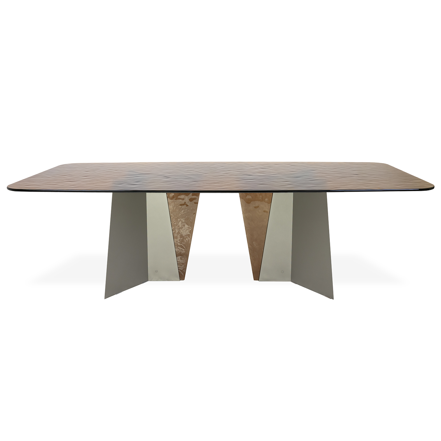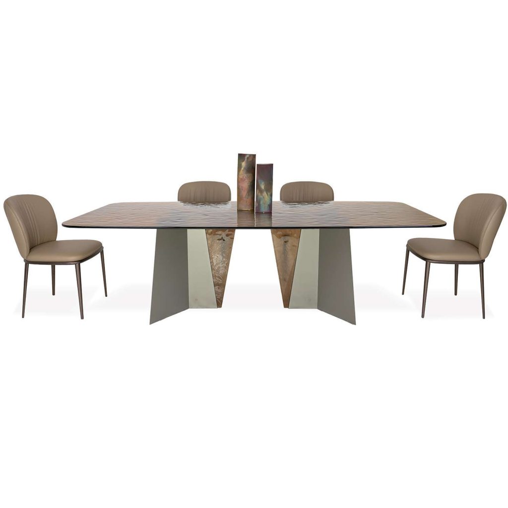 [0] => Make an unforgettable impression with the Grus Dining Table, featuring a champagne-tinted melted glass top whose beautifully worked surface evokes the look of rippling water. The titanium metal base is built with inserts in matching champagne glass, while the angular shape of the legs creates a contrast to the rounded edges of the tabletop. Made in the Pesaro province of Italy with a blend of traditional and modern techniques, Grus is a stunning table ideal for contemporary dining rooms.