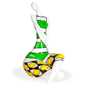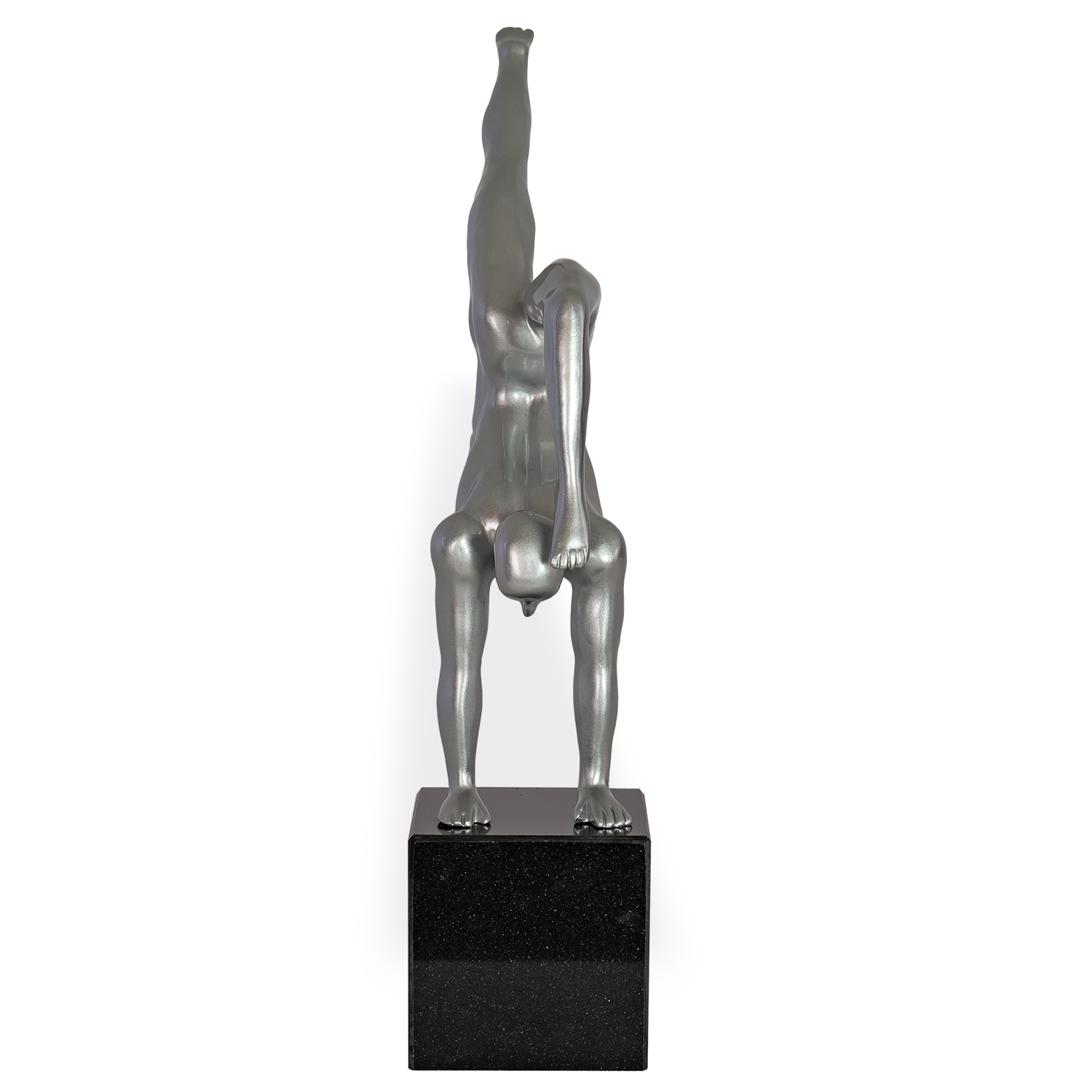 Exuding strength and poise, the Gymnastic Silver Man poses in a handstand with one leg extended and one leg bending back to nearly touch his head. Made of polyresin with a silver finish, this sculpture is mounted on a cubical black marble base that lets you display it with ease on any flat surface.