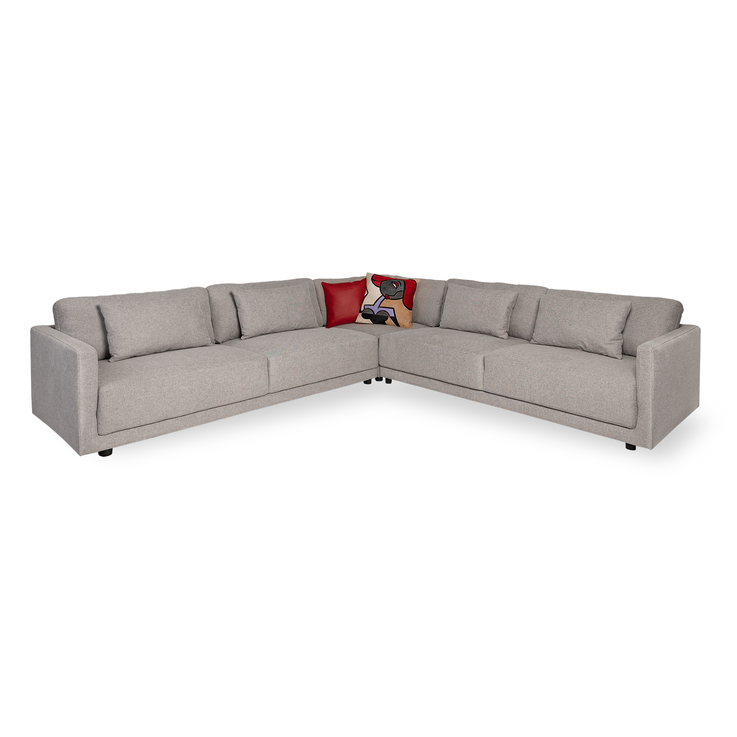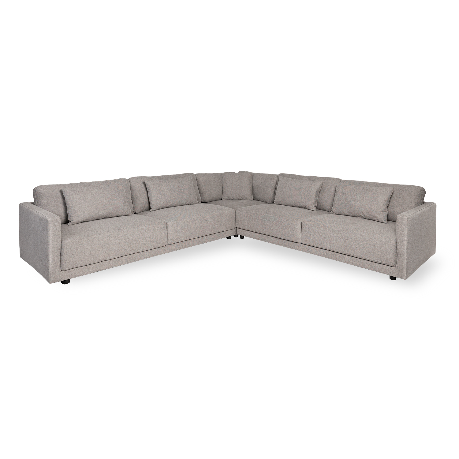 The Hagen Sectional has a pleasing symmetrical design, with right and left-armed sofa sections connected by a corner seat. Upholstered in cozy light grey Belfast fabric, Hagen features wide seat cushions with a springy feel and plush back cushions that are fully moveable. As a bonus, this sectional includes five accent pillows -- four rectangular and one square -- for decoration and extra back support. With its soft lines and classic look, Hagen beckons you and your guests to sink in and treat yourselves to some much-needed relaxation.