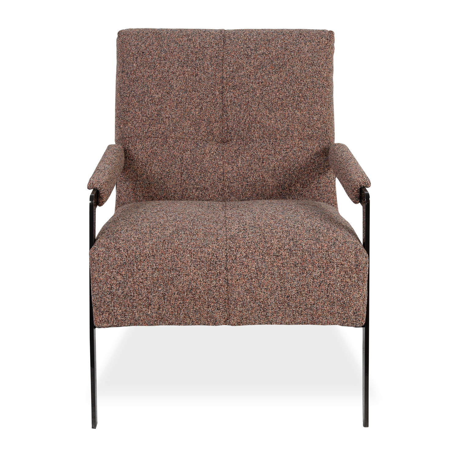 The Hanna Armchair, made in Italy, has a chic modern design, with angular smoke grey legs, square tufting, and textured, woven upholstery. The seat and armrests are upholstered in melon Caleido fabric with variegated tones of orange, brown, blue, and black. The bright fabric, made from 71% cotton and 29% polyester, gives the chair a bold retro feel that will make Hanna an eye-catching addition to any room.