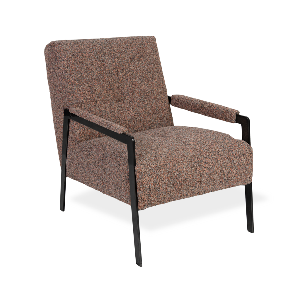 [0] => The Hanna Armchair, made in Italy, has a chic modern design, with angular smoke grey legs, square tufting, and textured, woven upholstery. The seat and armrests are upholstered in melon Caleido fabric with variegated tones of orange, brown, blue, and black. The bright fabric, made from 71% cotton and 29% polyester, gives the chair a bold retro feel that will make Hanna an eye-catching addition to any room.