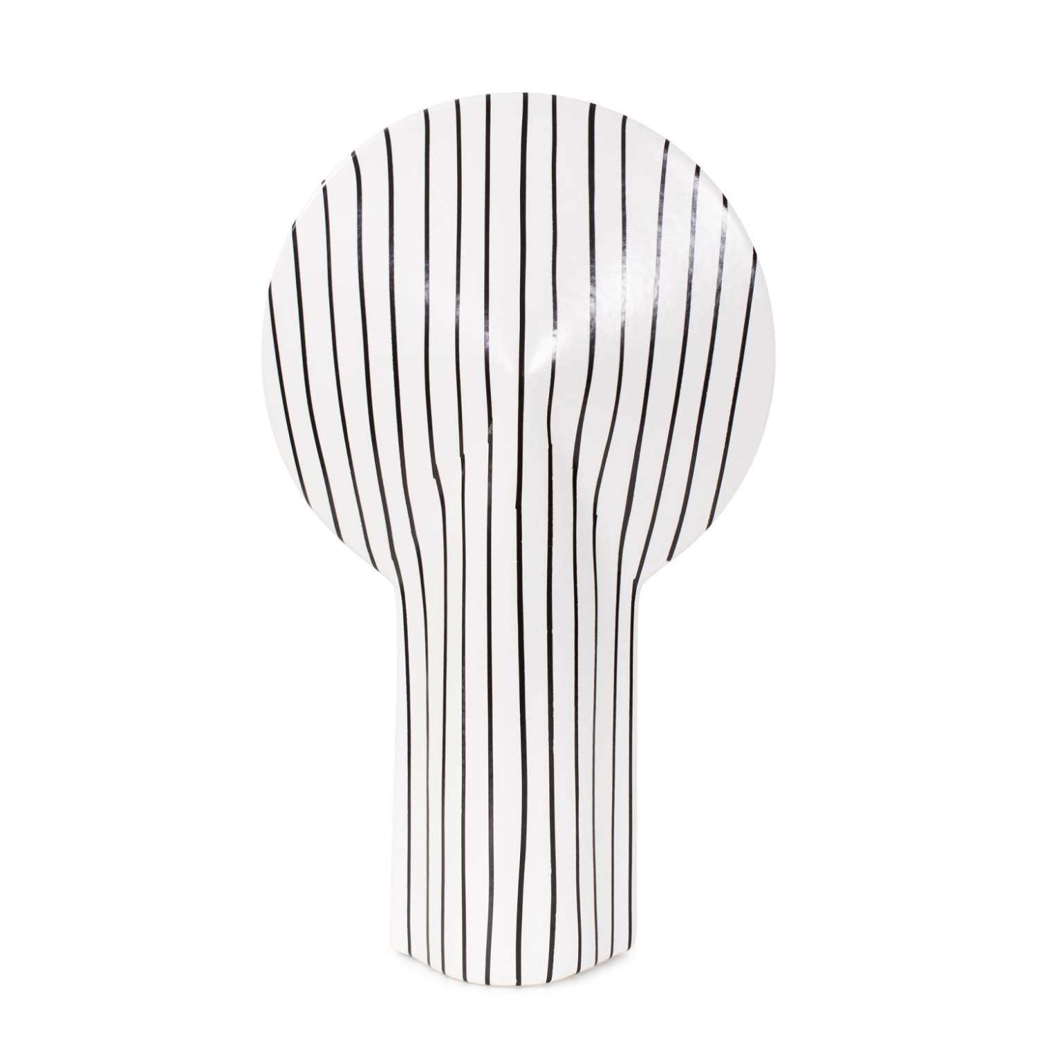 Made of matte white ceramic, the Hansford Keyhole Short Vase features a black striped pattern and an eye-catching form with an enclosed, circular upper section that rests on an elongated base. Though not able to hold a bouquet like a traditional vase, Hansford is nonetheless a unique art object that will add flair to a range of contemporary interiors. Pair with the companion Hansford Keyhole Tall Vase for a one-of-a-kind statement.