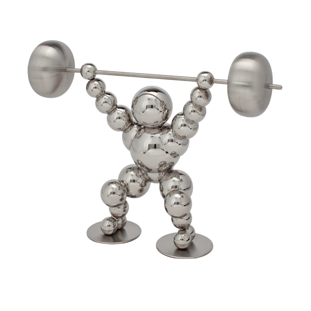 [0] => Fashioned from hand-painted stainless steel, the Harbody Sculpture depicts a figure made of reflective silver spheres lifting a barbell above their head. The strong and dynamic pose contrasted with the more whimsical design makes Harbody a unique gift for an athlete, bodybuilder, or any lover of both sculpture and sports.