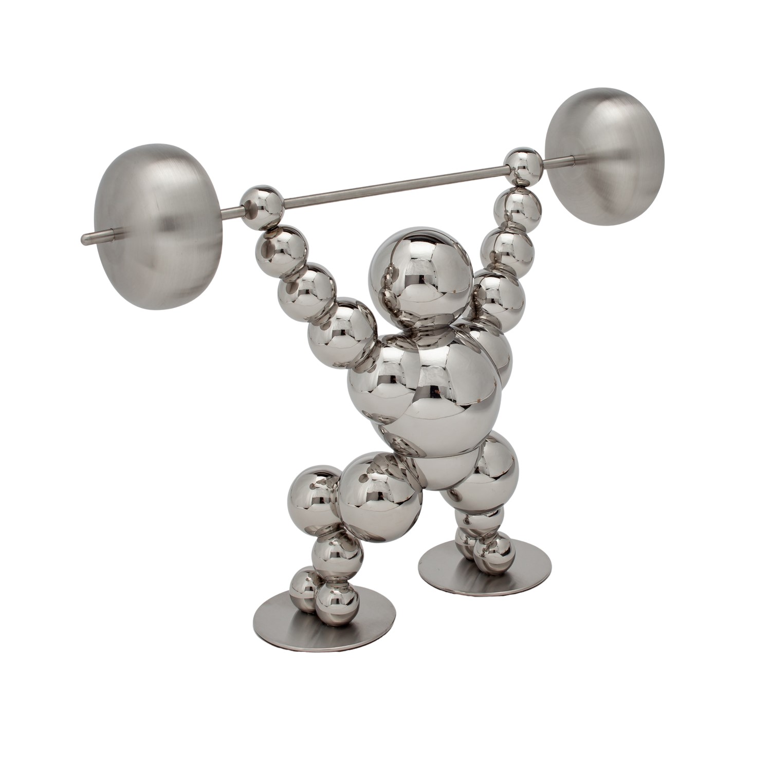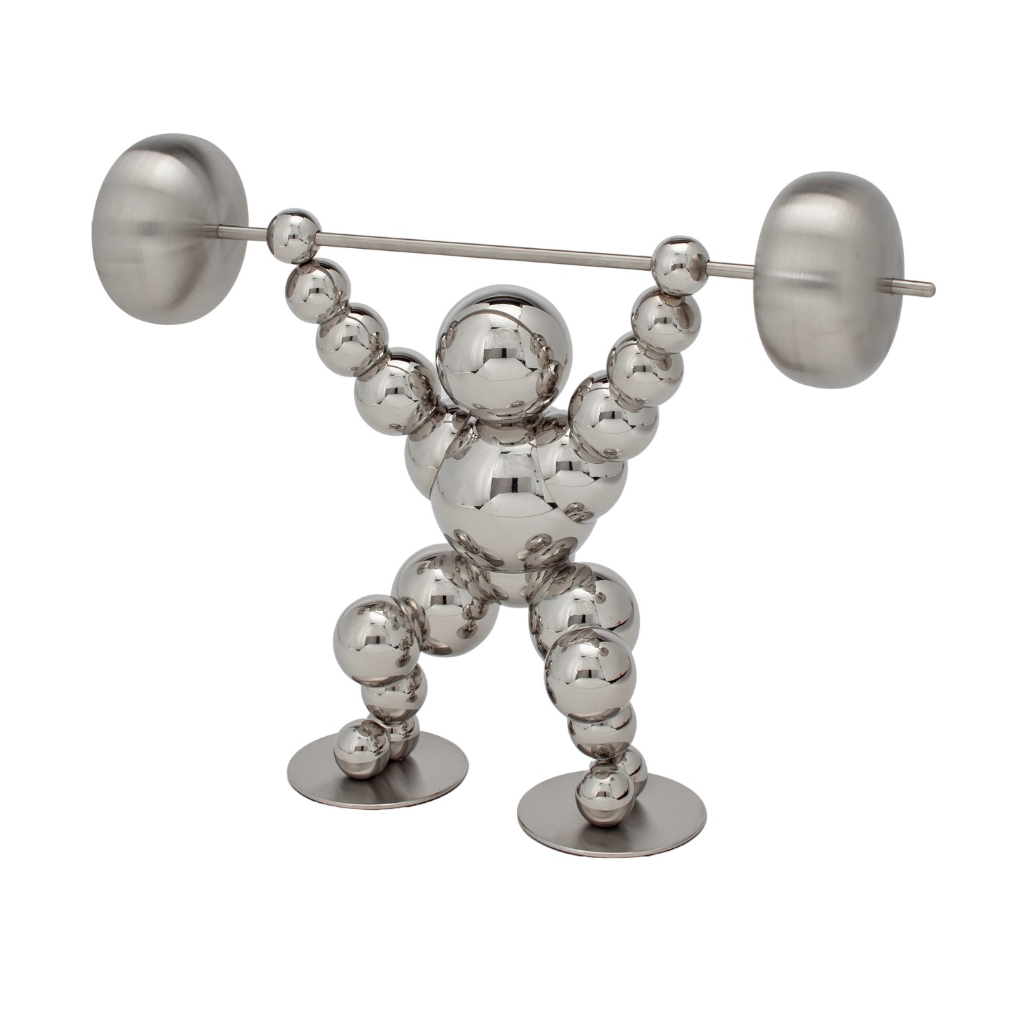Fashioned from hand-painted stainless steel, the Harbody Sculpture depicts a figure made of reflective silver spheres lifting a barbell above their head. The strong and dynamic pose contrasted with the more whimsical design makes Harbody a unique gift for an athlete, bodybuilder, or any lover of both sculpture and sports.
