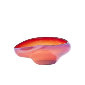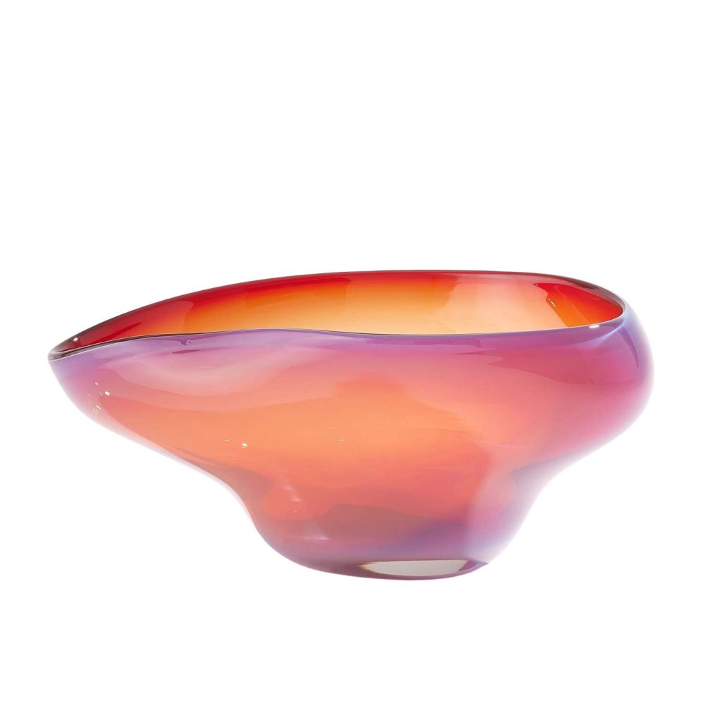 Beautifully crafted from handblown art glass, the Harmony Large Bowl has a dynamic design that creates a sense of fluidity and movement. Harmony's organic, asymmetrical shape is unique to each piece, making each bowl one of a kind, and its cloudy red hue shifts depending on the angle of light. This bowl is food safe, watertight, and features an abstract sculptural look, making it perfect for dining or display.