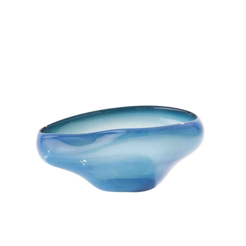Beautifully crafted from handblown art glass, the Harmony Small Bowl has a dynamic design that creates a sense of fluidity and movement. Harmony's organic, asymmetrical shape is unique to each piece, making each bowl one of a kind, and its cloudy dark blue hue shifts depending on the angle of light. This bowl is food safe, watertight, and features an abstract sculptural look, making it perfect for dining or display.