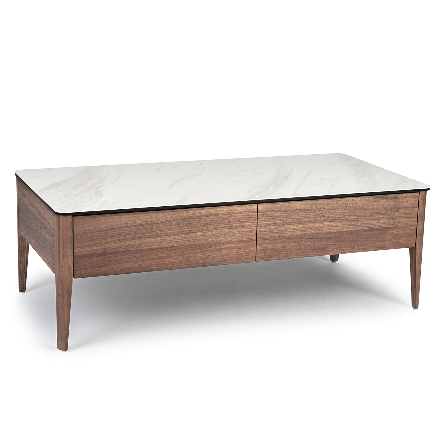 [0] => The Harwell Coffee Table, available in walnut with a white ceramic top, effortlessly combines a classic look with modern design. The two drawers provide ample storage space and feature carved handles that are subtly concealed by the design of the base. The mixture of wood and marble-looking ceramic brings a smooth, balanced look to the piece. Long and sleek, this piece can integrate into any design environment.