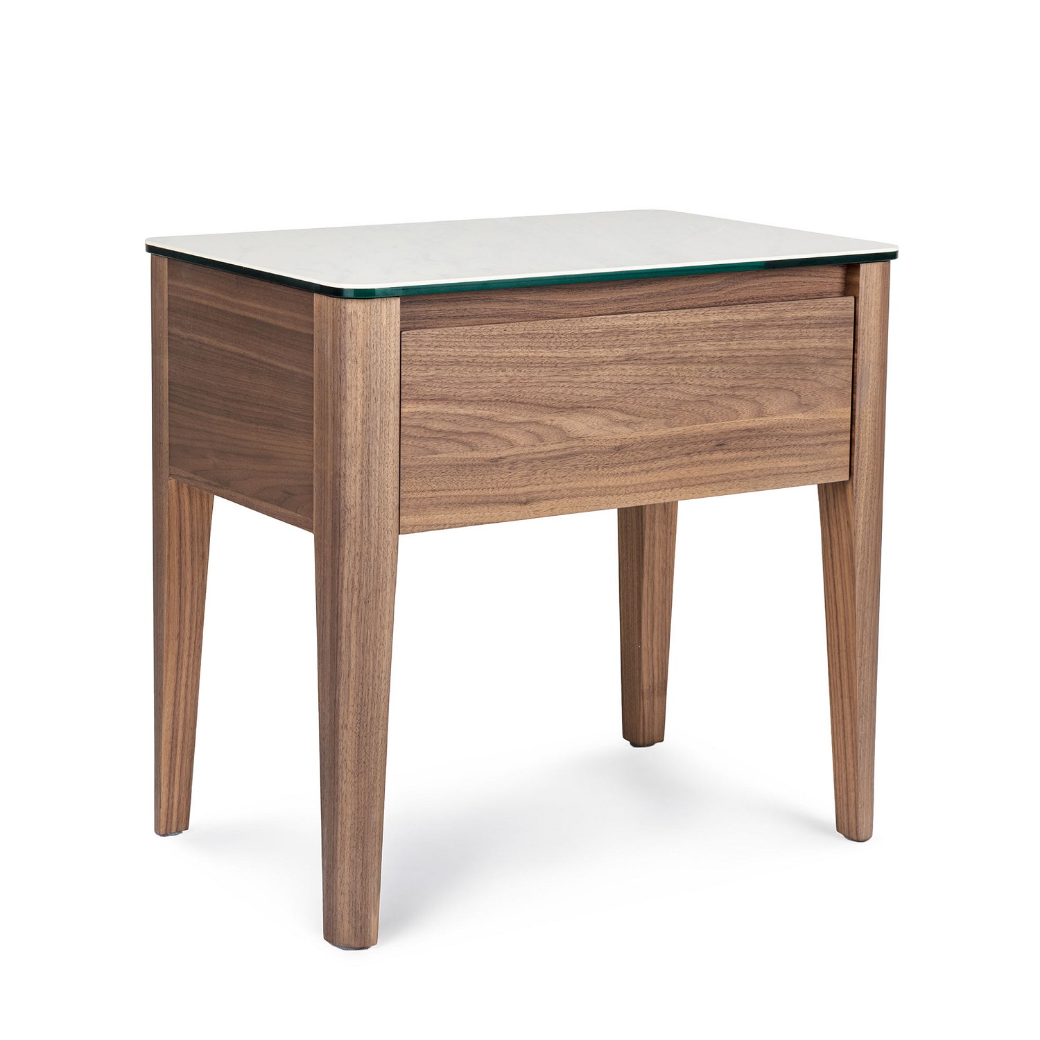 The Harwell Side Table, available in walnut with a white ceramic top, effortlessly combines a classic look with modern design. The drawer provides storage space and features a carved handle. The horizontal lines of the drawer contrasts the vertical ones of the legs, adding a textured look that is further heightened by the smooth ceramic top. Simple and sleek, this piece can integrate into any design environment.