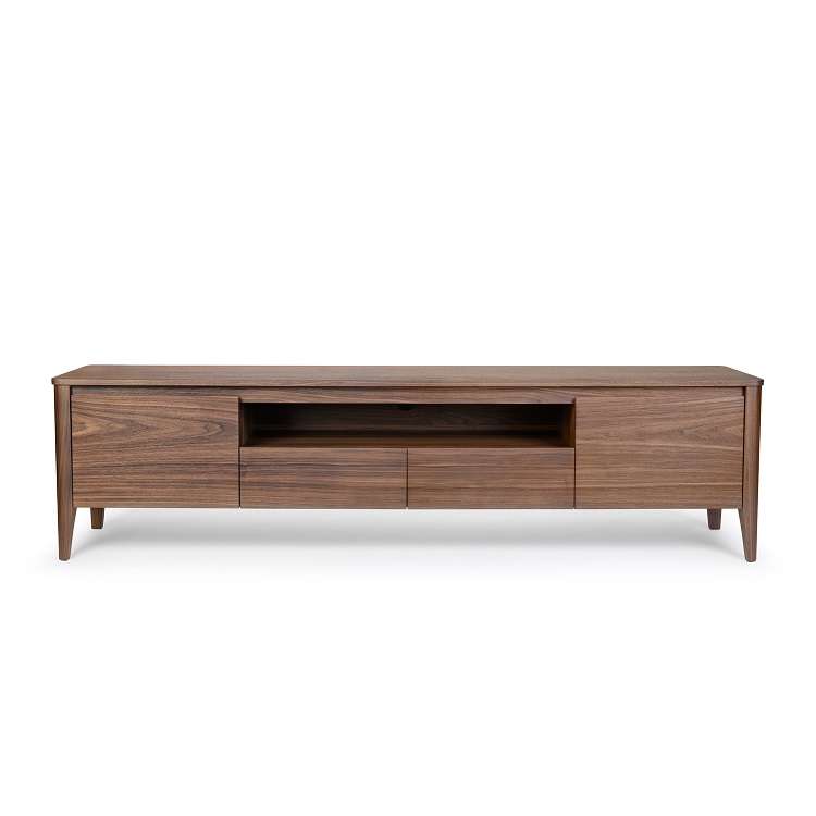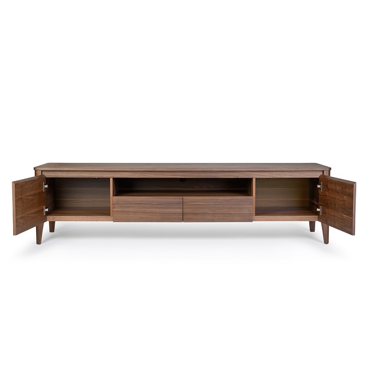 [0] => The Harwell TV stand, available with a walnut veneer, features clean lines and a mid-century modern inspired design. Harwell has two roomy storage cabinets and drawers to house your media equipment. There is also an open storage space above the drawers to house a sound bar or console.