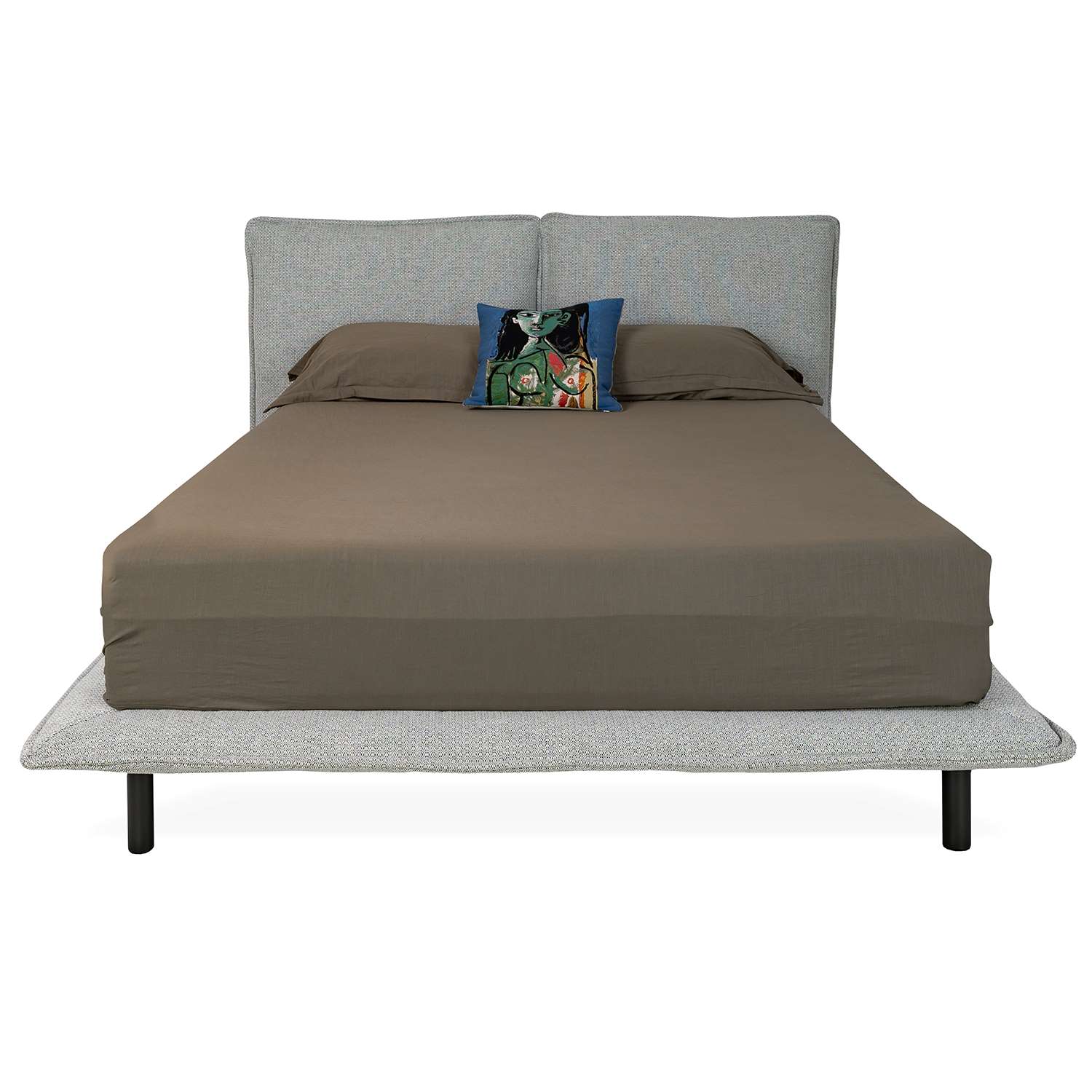 Embrace comfort and coziness with the Haven Queen Bed, featuring a headboard and lower frame upholstered in grey Oriana fabric with a variegated look and textural feel. Haven's headboard is made of two pillowed sections perfect for leaning back against to read or watch TV. Rounded legs in black metal finish out this modern platform bed that radiates relaxation.