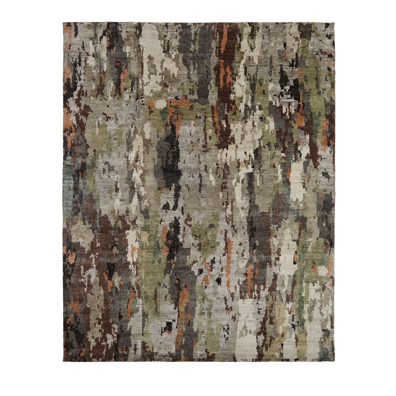 The Hazel rug is contemporary with variegated tones of dark taupes and browns. Hazel is handcrafted in a Turkish knot weave with hand-spun wool and Silkette, silk-like viscose yarns, against a natural cotton backing.