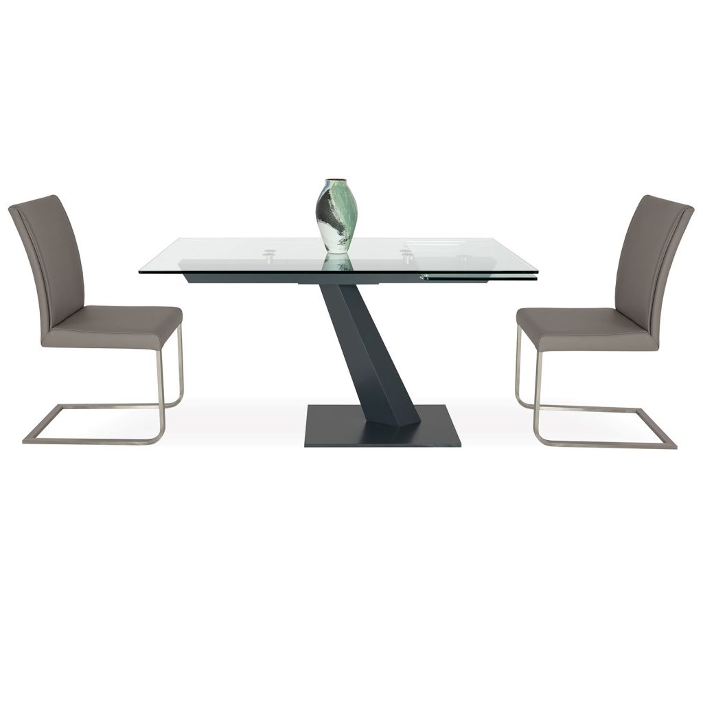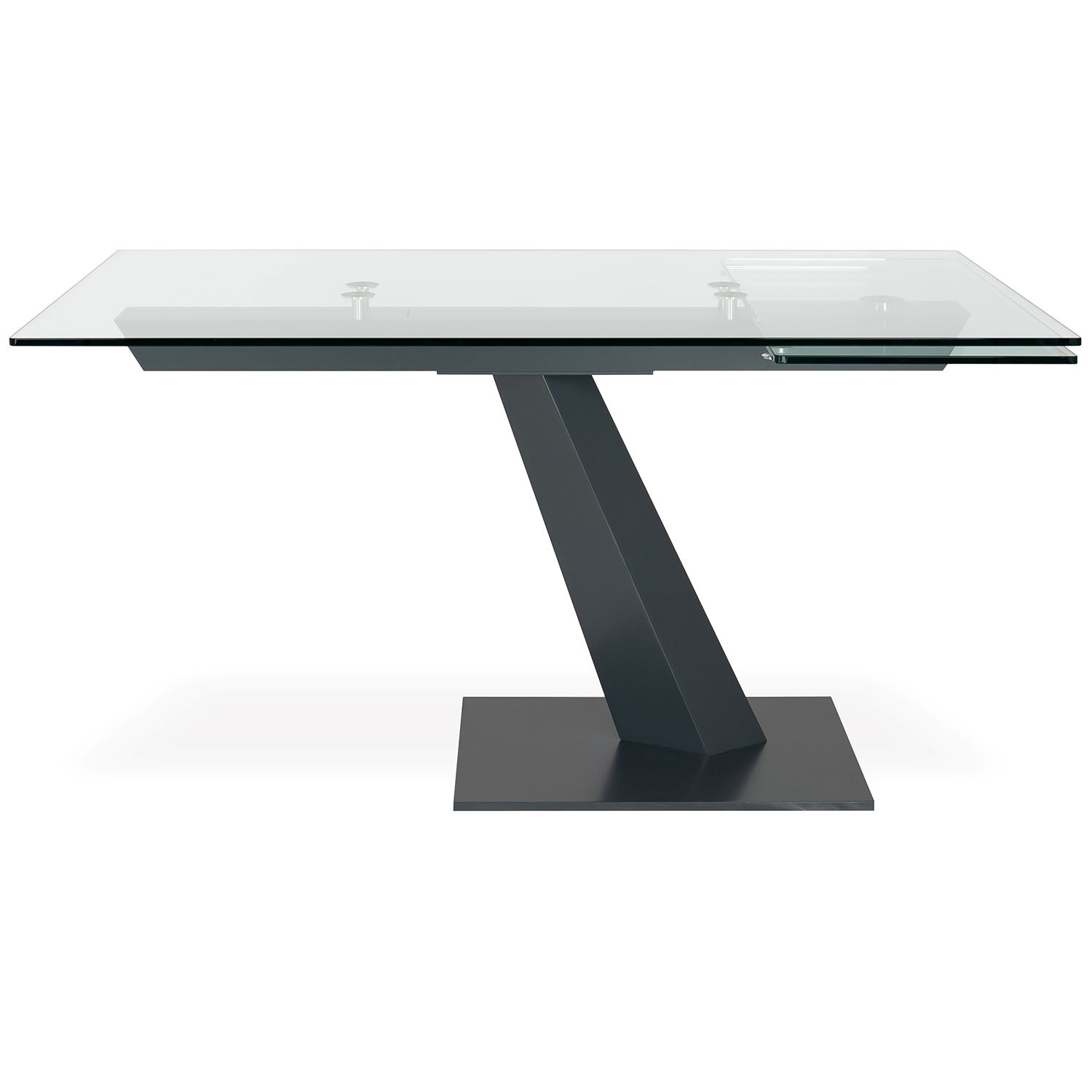 The Help dining table by NAOS of Italy, available with a natural glass tabletop and graphite powder coat base, is a beautiful contemporary dining table with an angled sculptural base. The Help table lives up to its name by "helping" you save space -- it has an extendable leaf that lengthens the tabletop from 55''-71''.