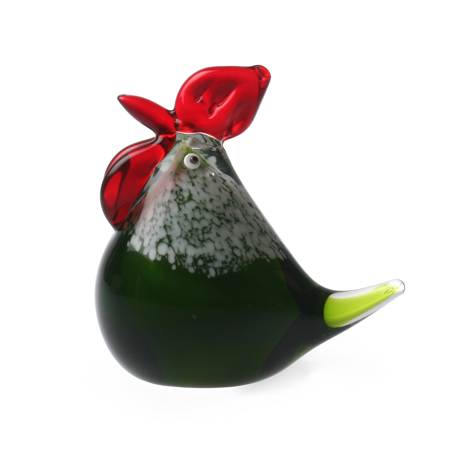 [0] => The Hen Green Scupture brings radiance to your daily life with a deep green base and vibrant red beak. The glossy finish highlights the variations of color within the glass, which create various shapes and movement. The chartreuse tail peaks out delicately with a rounded end, and adds a bright contrast.