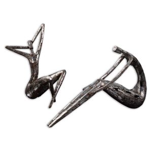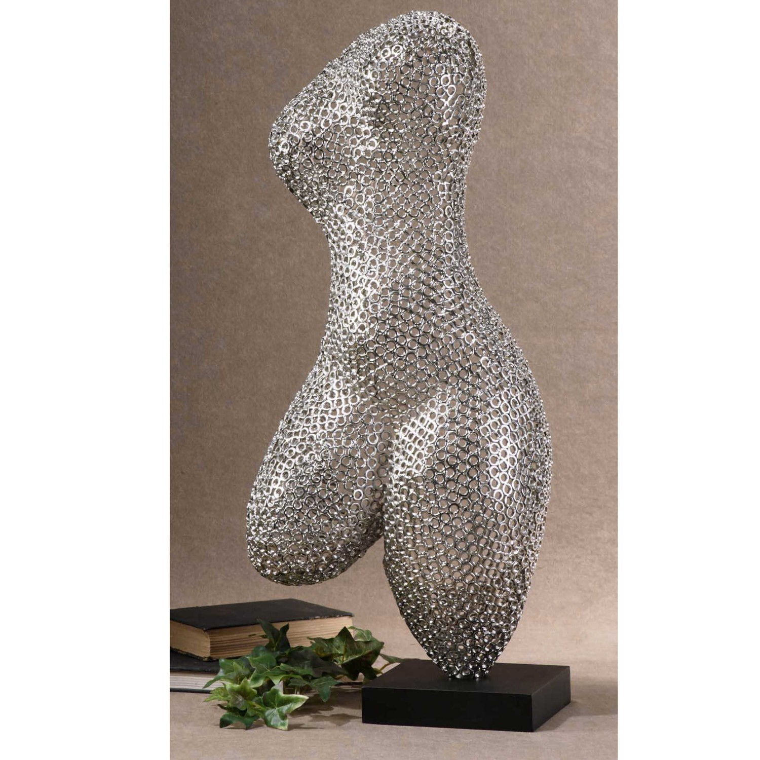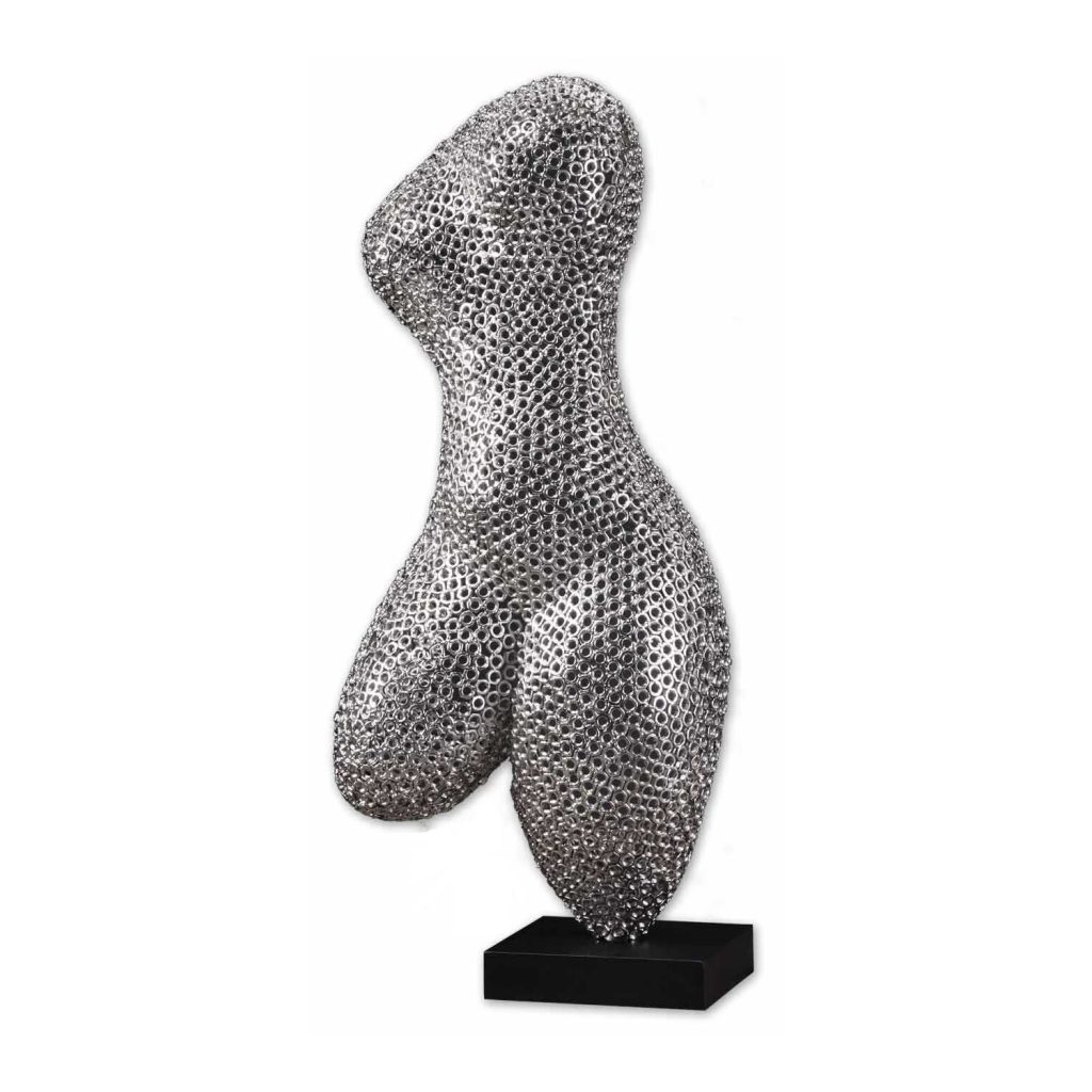 [0] => The Hera Sculpture uses a combination of curves and angles to create part of a female body from hand-forged metal. The nickel plated finish brings an edgy texture to a classic subject, as the sculpture seems to float atop its matte black base.