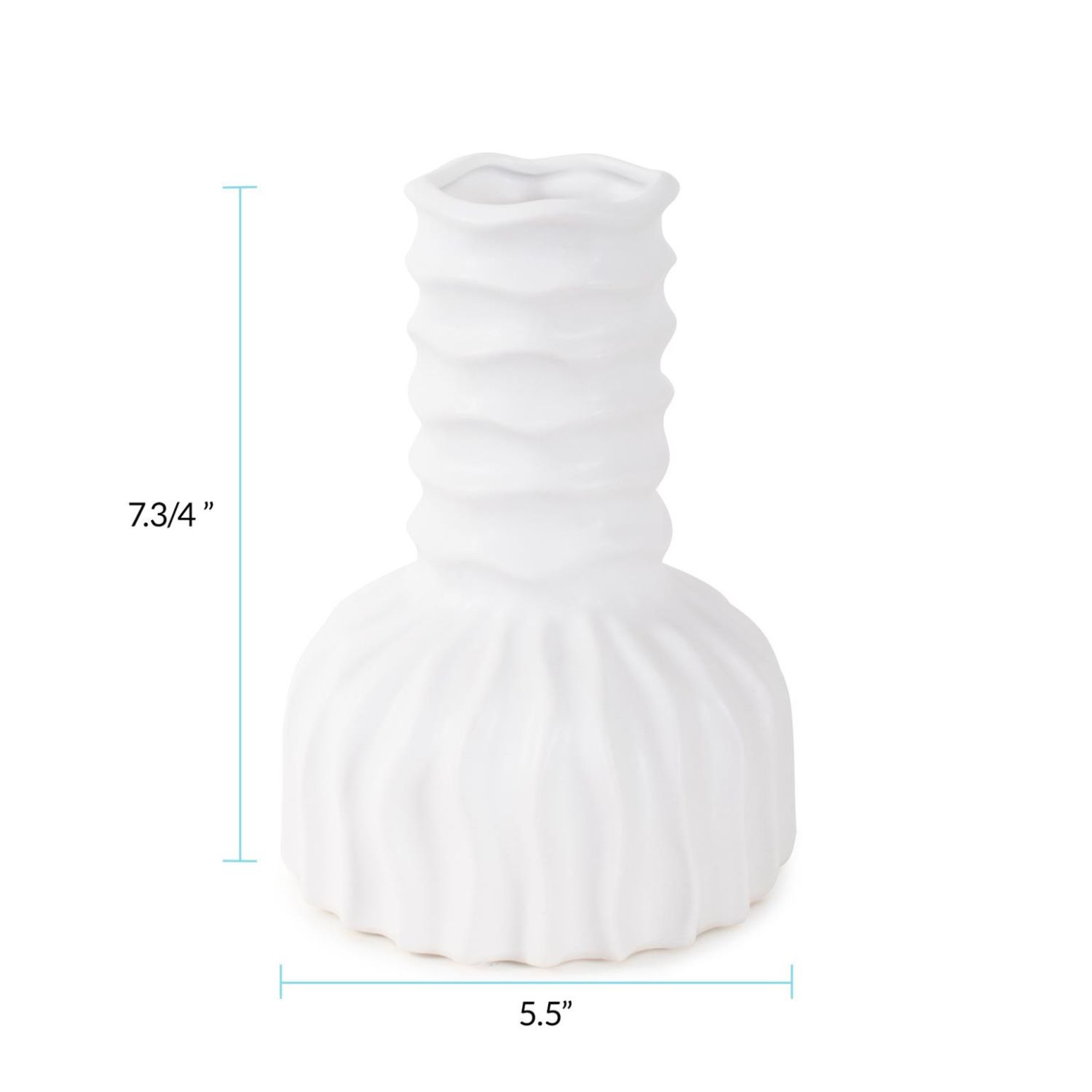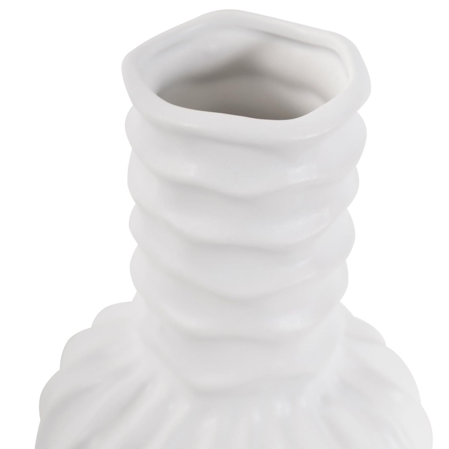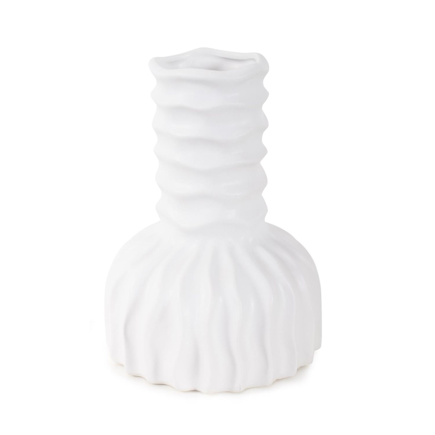 The Herring Vase adds sculptural appeal to modern interiors. Expertly crafted from high-quality ceramic and showcases an abstract matte white finish. The vase is designed with a layered texture and an organic form that makes it an exceptional accent piece, perfect for shelves, mantels, or tabletops.