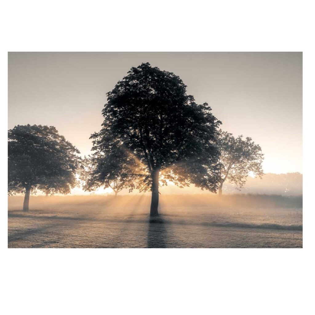 [0] => The Hidden Treasure Wall Art features cool neutral tones in a landscape of trees. The subtle warmth of the sun shines shines behind the trees, creating shadows and silhouettes against a misted background. Soothing and picturesque, this artwork brings a touch of nature into your living or office space.