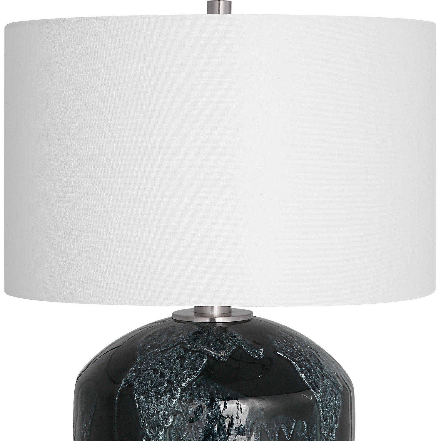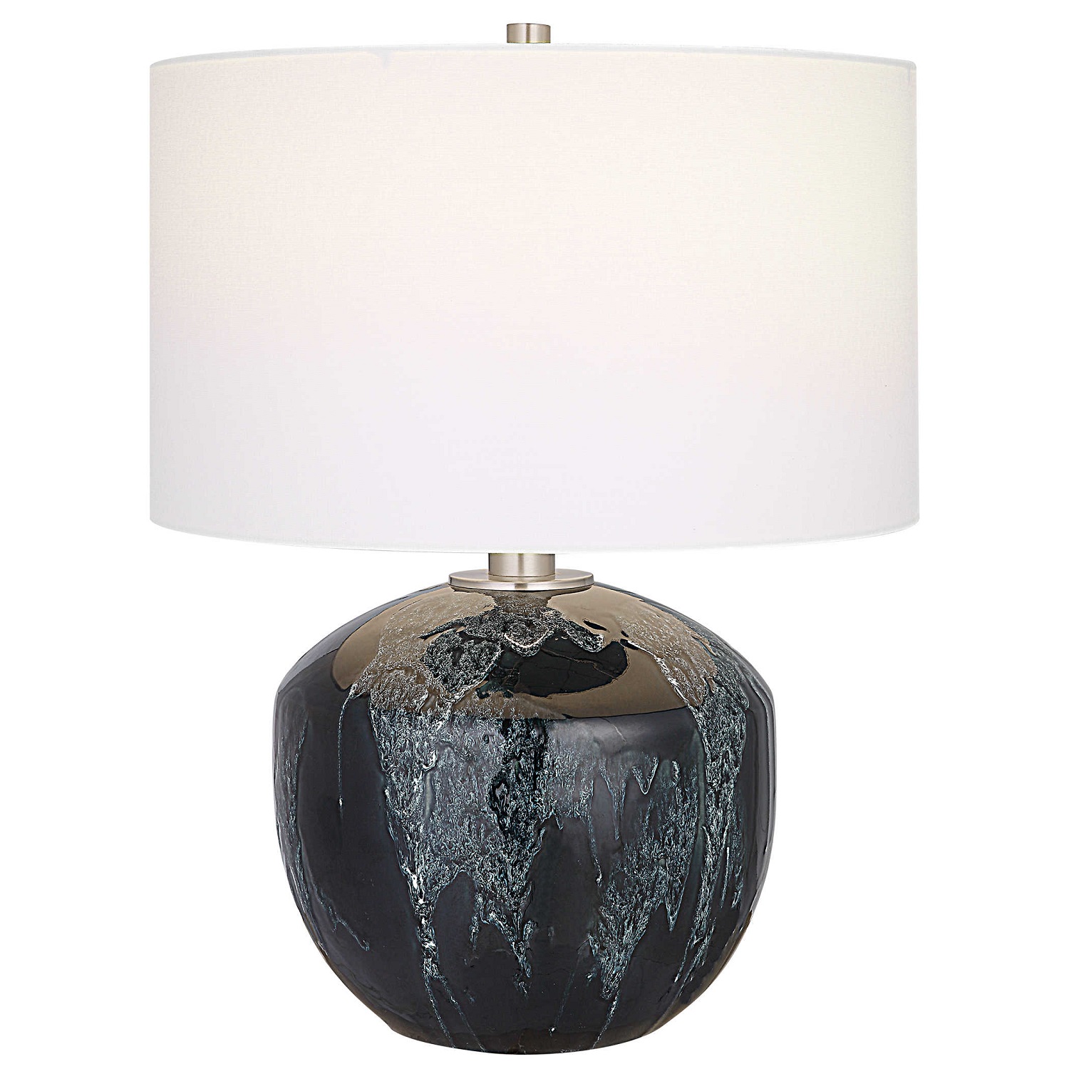 Bold and eye-catching, the Highlands Table Lamp features a ceramic base with a deep, emerald green drip glaze. Subtle ivory undertones add texture, and a white fabric drum shade smoothly contrasts the dark base. The brushed nickel plated stem heightens the cool tones of this piece.