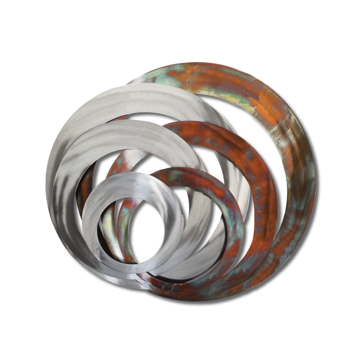 Hollow is a contemporary wall sculpture featuring six overlapping metal rings. Made of ground, tinted, and flame colored steel, the bright silver finish of three of the rings contrasts with the more brass-like and aged look of the other three rings. Hollow can be hung in any orientation, making it a versatile and eye-catching piece that will liven up any modern interior.