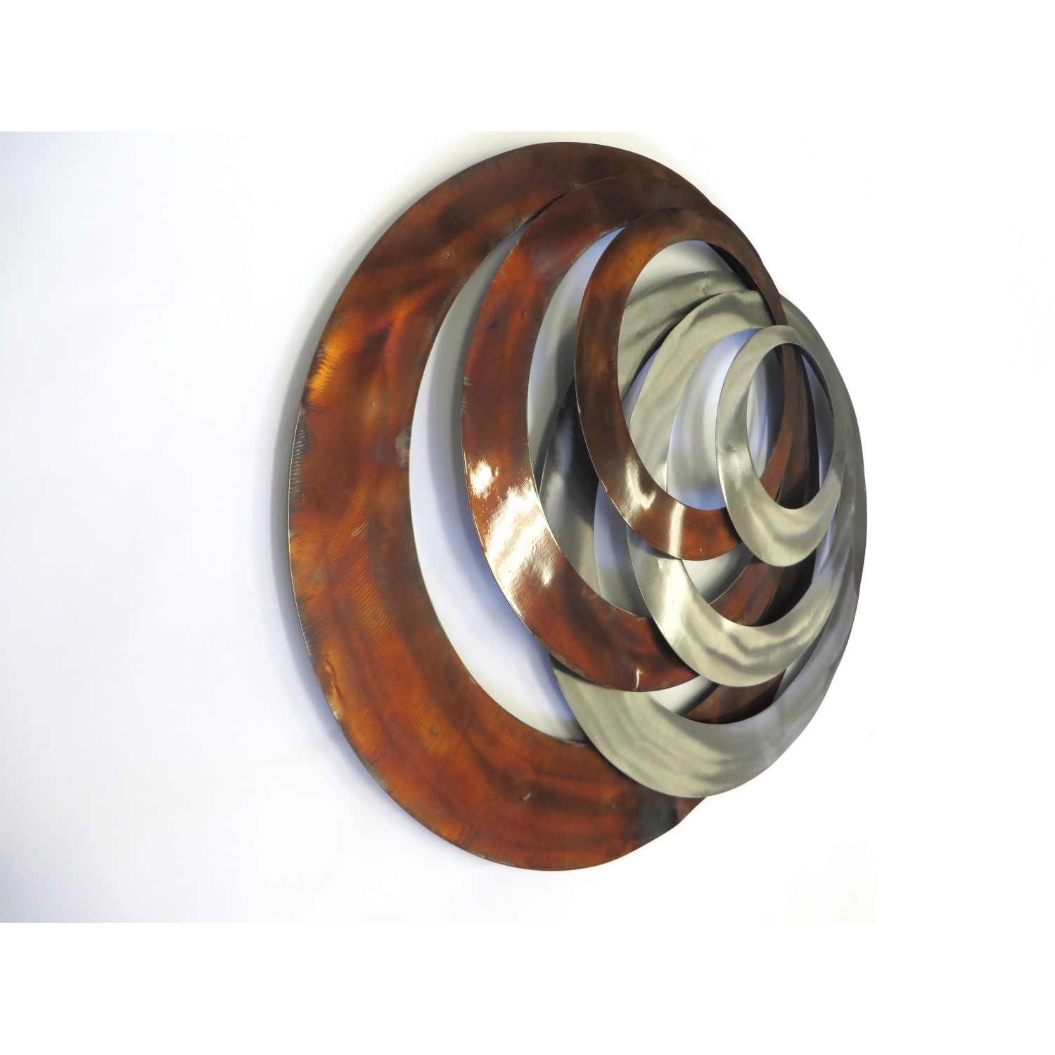 [0] => Hollow is a contemporary wall sculpture featuring six overlapping metal rings. Made of ground, tinted, and flame colored steel, the bright silver finish of three of the rings contrasts with the more brass-like and aged look of the other three rings. Hollow can be hung in any orientation, making it a versatile and eye-catching piece that will liven up any modern interior.