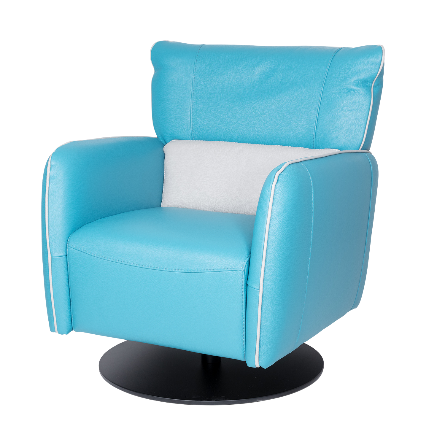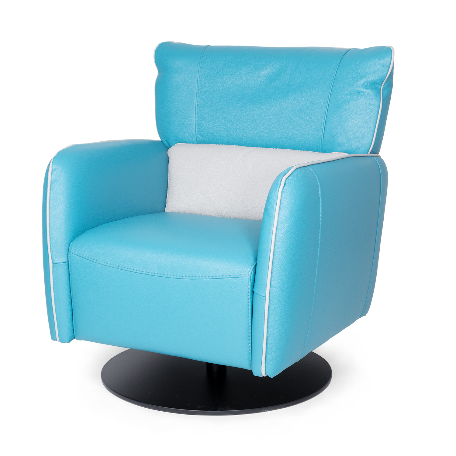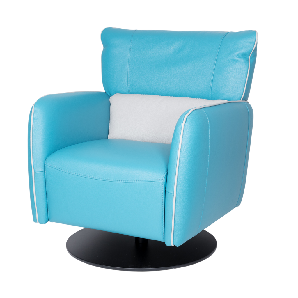 [0] => The Honey Glider Chair features bright turquoise leather, an amply cushioned seat and back, and gently curved arms and seams for a chic, retro look. Contrast piping in light grey leather matches the lumbar cushion and highlights the chair's silhouette. The round black stainless-steel base is equipped with a manual glider mechanism, which allows the chair to rock, swivel, and glide to increase your comfort and relaxation.