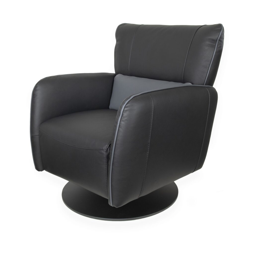 [0] => honey swivel/glider/rocker chair with main cover in black bull 1050 with piping and lumbar cushion in anthracite bull 1015, black-nero ral 9005 base.