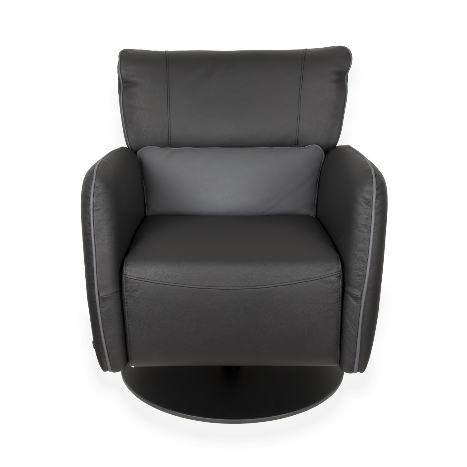 [0] => The Honey Glider Chair features black leather, an amply cushioned seat and back, and gently curved arms and seams for a chic, retro look. Contrast piping in grey leather matches the lumbar cushion and highlights the chair's silhouette. The round black stainless-steel base is equipped with a manual glider mechanism, which allows the chair to rock, swivel, and glide to increase your comfort and relaxation.