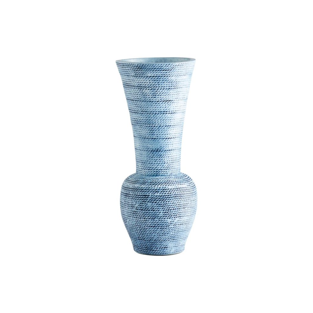 [0] => Designed by J. Kent Martin and handmade by skilled artisans, the Large Hopewell Vase features a striking texture and dramatic shape that will lend pizzazz to any room. This vase is inspired by the ancient tradition of cord-marked pottery, with a jute rope texture applied to its blue glaze that creates rows of darker-hued indentations. Hopewell has a distinctive form, with an urn-shaped lower half that flares upward into a long neck with a wide mouth, offering plenty of space for a generous arrangement of artificial foliage.