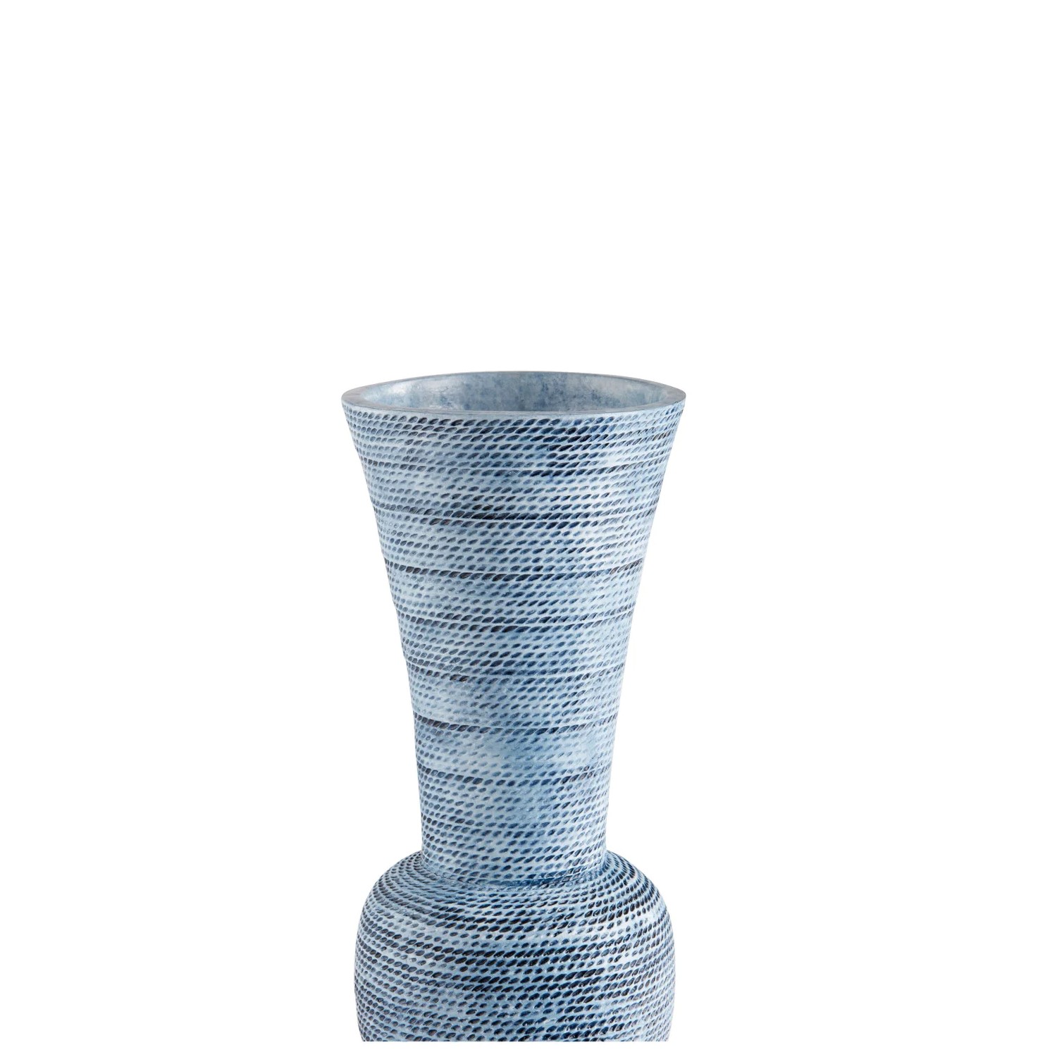 Designed by J. Kent Martin and handmade by skilled artisans, the Large Hopewell Vase features a striking texture and dramatic shape that will lend pizzazz to any room. This vase is inspired by the ancient tradition of cord-marked pottery, with a jute rope texture applied to its blue glaze that creates rows of darker-hued indentations. Hopewell has a distinctive form, with an urn-shaped lower half that flares upward into a long neck with a wide mouth, offering plenty of space for a generous arrangement of artificial foliage.