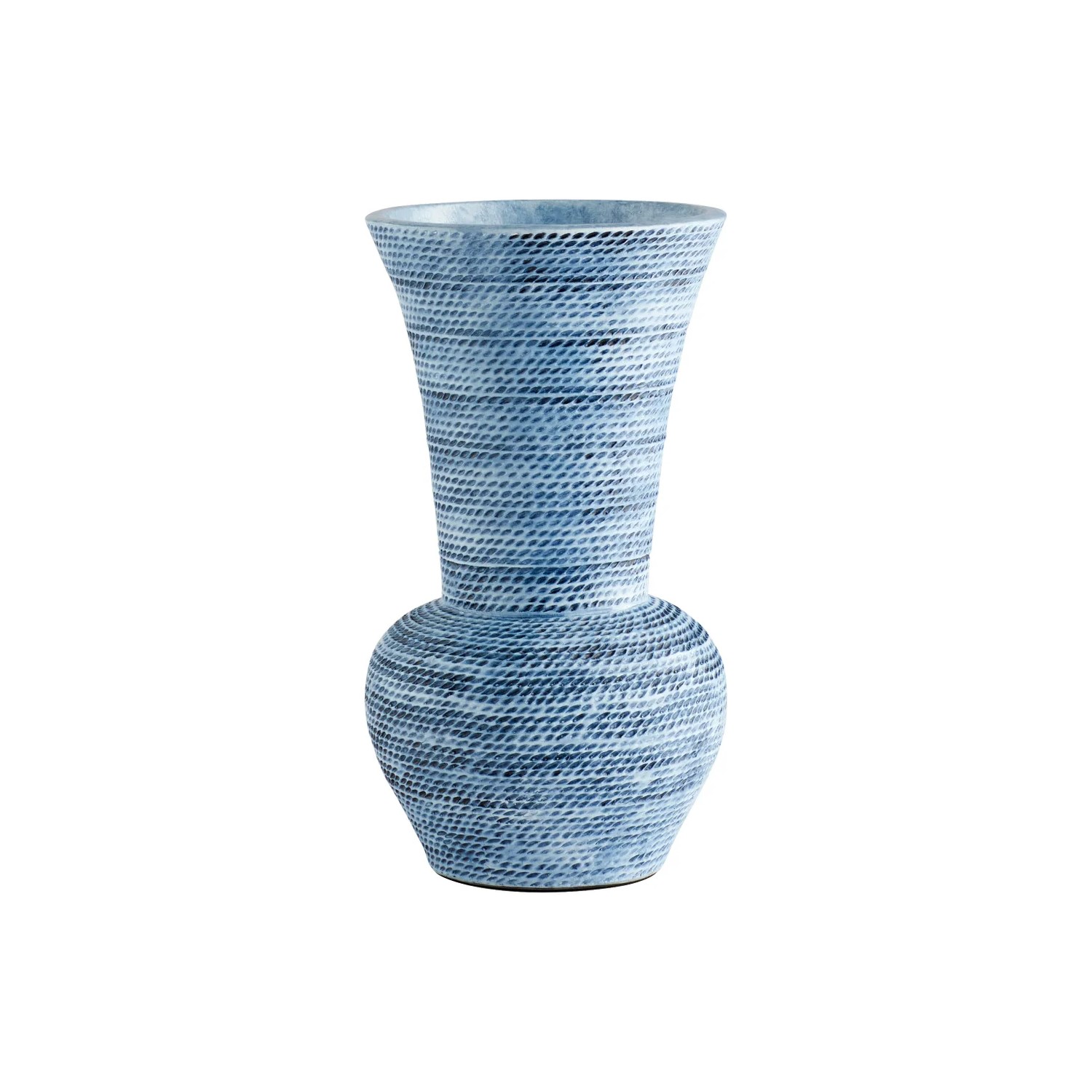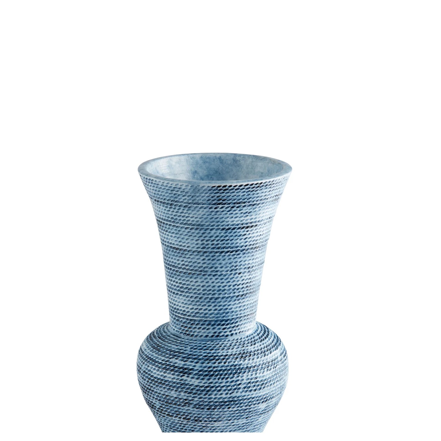 Designed by J. Kent Martin and handmade by skilled artisans, the Small Hopewell Vase features a striking texture and dramatic shape that will lend pizzazz to any room. This vase is inspired by the ancient tradition of cord-marked pottery, with a jute rope texture applied to its blue glaze that creates rows of darker-hued indentations. Hopewell has a distinctive form, with an urn-shaped lower half that flares upward into a long neck with a wide mouth, offering plenty of space for a generous arrangement of artificial foliage.