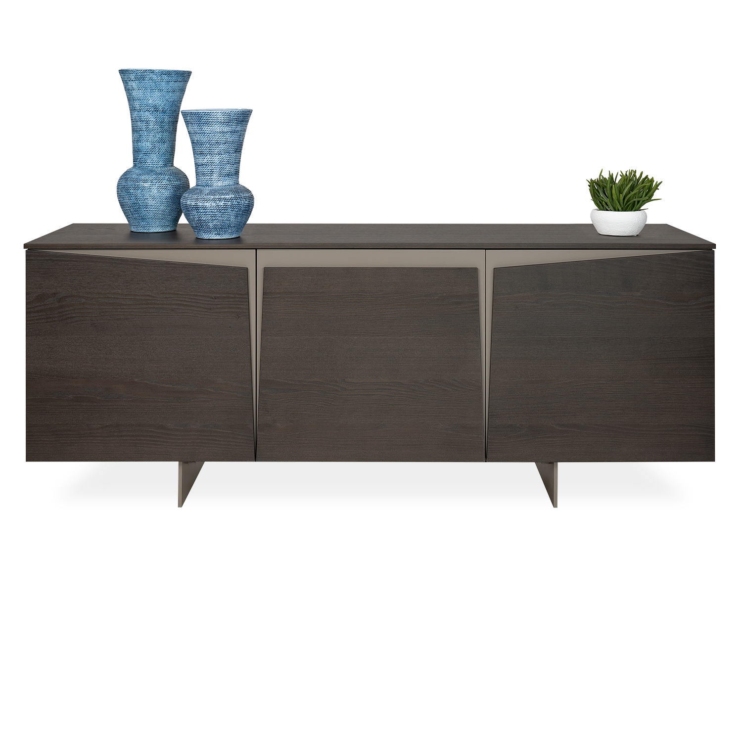 The Horizon Three-Door Cupboard melds the elegant look of caffe-stained ashwood with an artful modern twist. Horizon's three doors have inner corner cutouts that reveal an underlayer in light brown lacquer, forming a distinctive contrast to the surrounding wood grain. The back of each door, as well as the slim metal legs and supporting framework, are finished in the same lacquer for a unique, yet cohesive, look. Push-to-open mechanisms make each door easy to open, while adjustable glass shelves in each cabinet allow you to customize your storage setup.