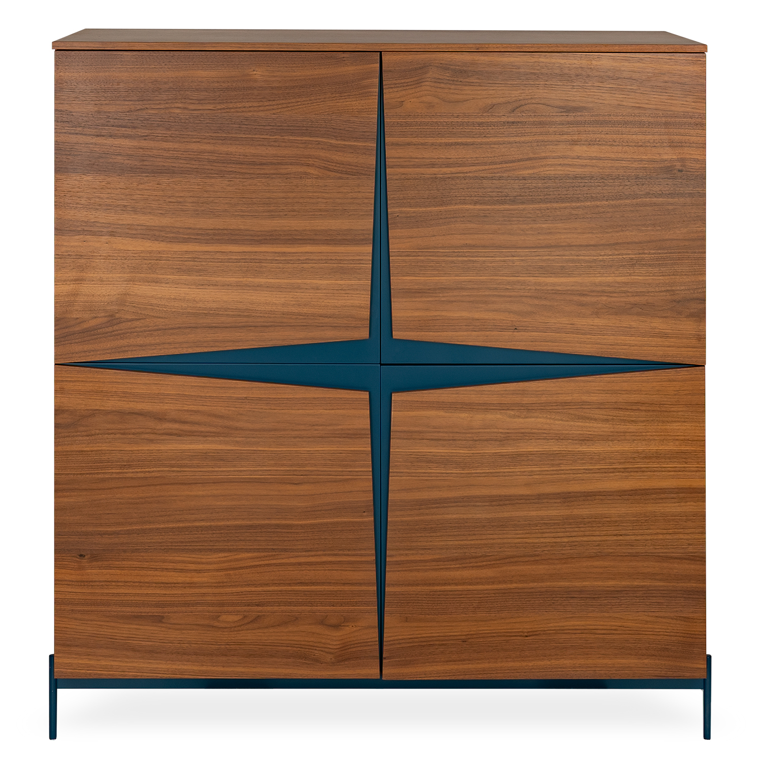 The Horizon Four-Door Cupboard melds the timeless look of Canaletto walnut wood with an artful modern twist. Horizon has a square front with four doors whose inner corner cutouts reveal an underlayer in bright blue "Ottanio" lacquer, forming a distinctive starburst shape. The back of each door, as well as the slim metal legs and supporting framework, are finished in the same lacquer for a unique, yet cohesive, look. Push-to-open mechanisms make each door easy to open, while adjustable glass shelves in each cabinet allow you to customize your storage setup.