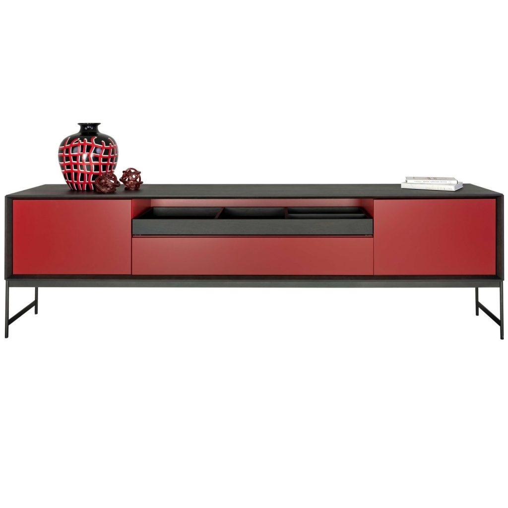 The Horizon Low Sideboard has a sleek contemporary look with a matte lacquered finish in stylish "Rubino" red. Made in Italy, this innovative sideboard features an open shelf with a pull-out drawer in dark walnut veneer with four handy compartments. Two cabinet doors and a large bottom drawer have push-to-open mechanisms that allow easy storage and retrieval of your dining or living room essentials. Supported by slim metal legs and horizontal cross bars with a matte black finish, Horizon is an effortlessly elegant sideboard made for modern living.