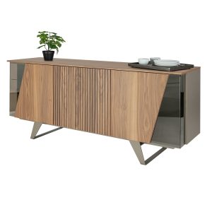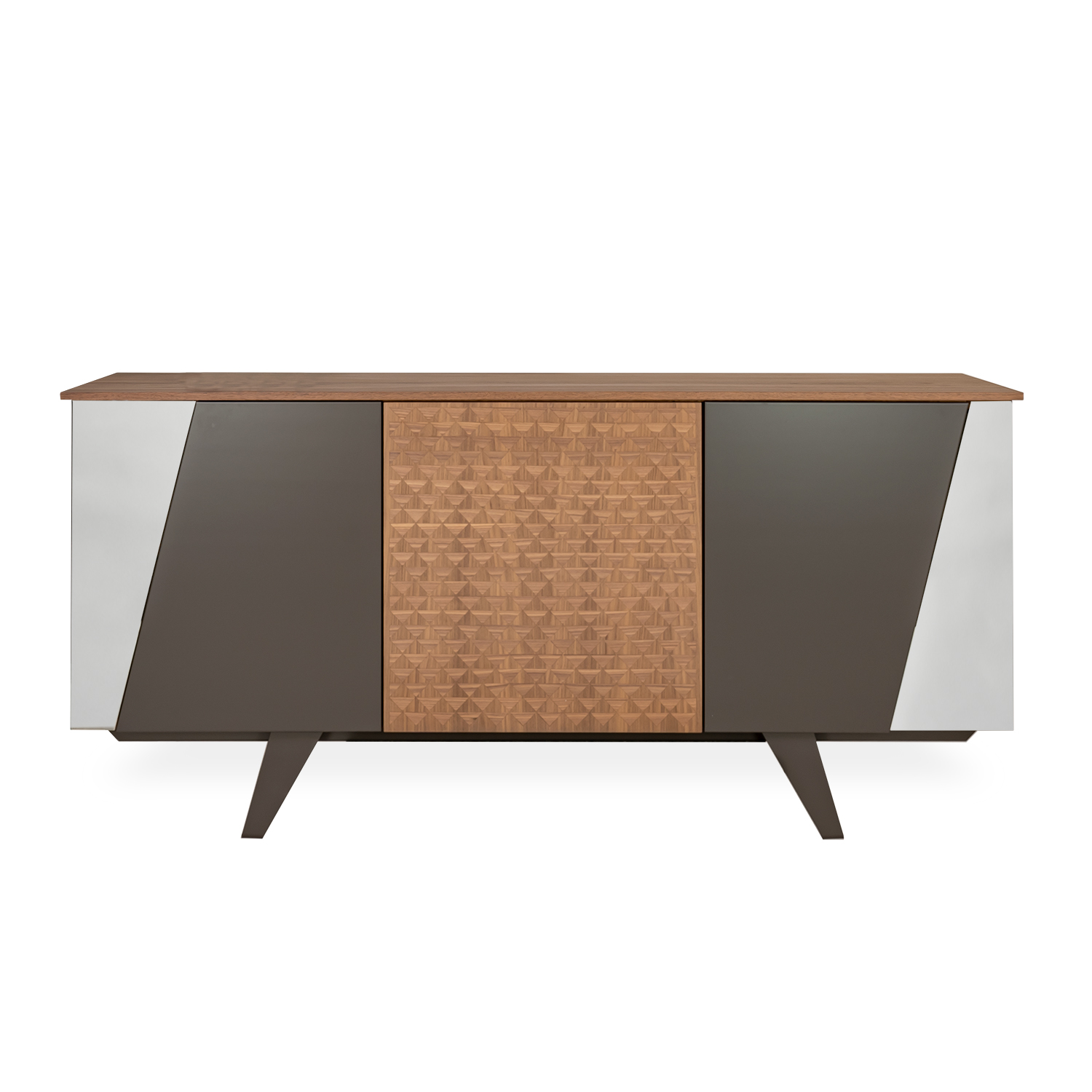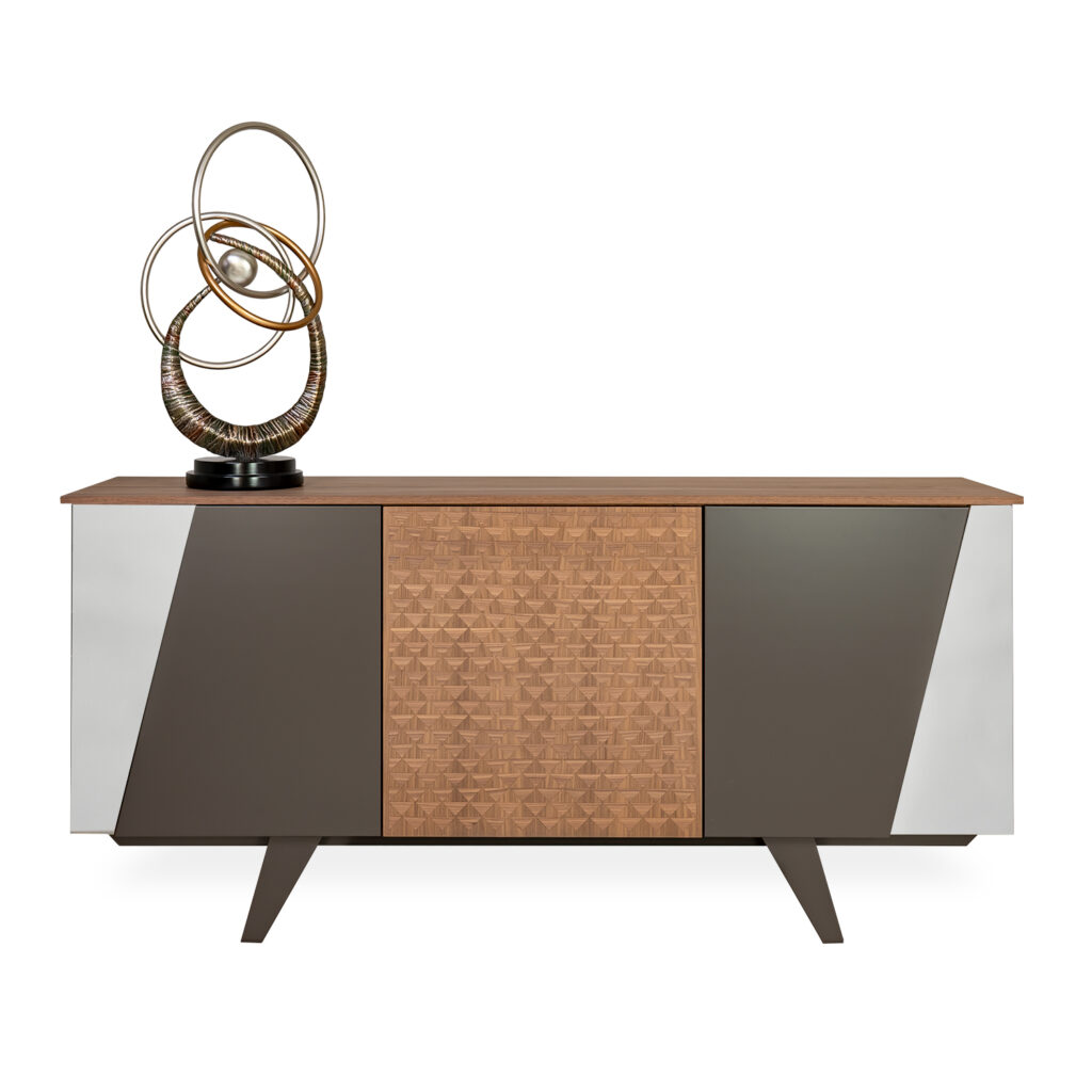 The Horizon Three-Door Cupboard melds the timeless look of Canaletto walnut wood with artful modern design. Horizon's center door features an eye-catching diamond inlay pattern while its two side doors are finished in matte grey caffe lacquer with mirrored glass corners for a sophisticated effect. The elegant wood grain of the top and sides complements the carved front while the angled metal legs further enhance Horizon's bold look. Push-to-open mechanisms on the three doors allow easy access to the storage spaces within, customizable with adjustable glass shelves.