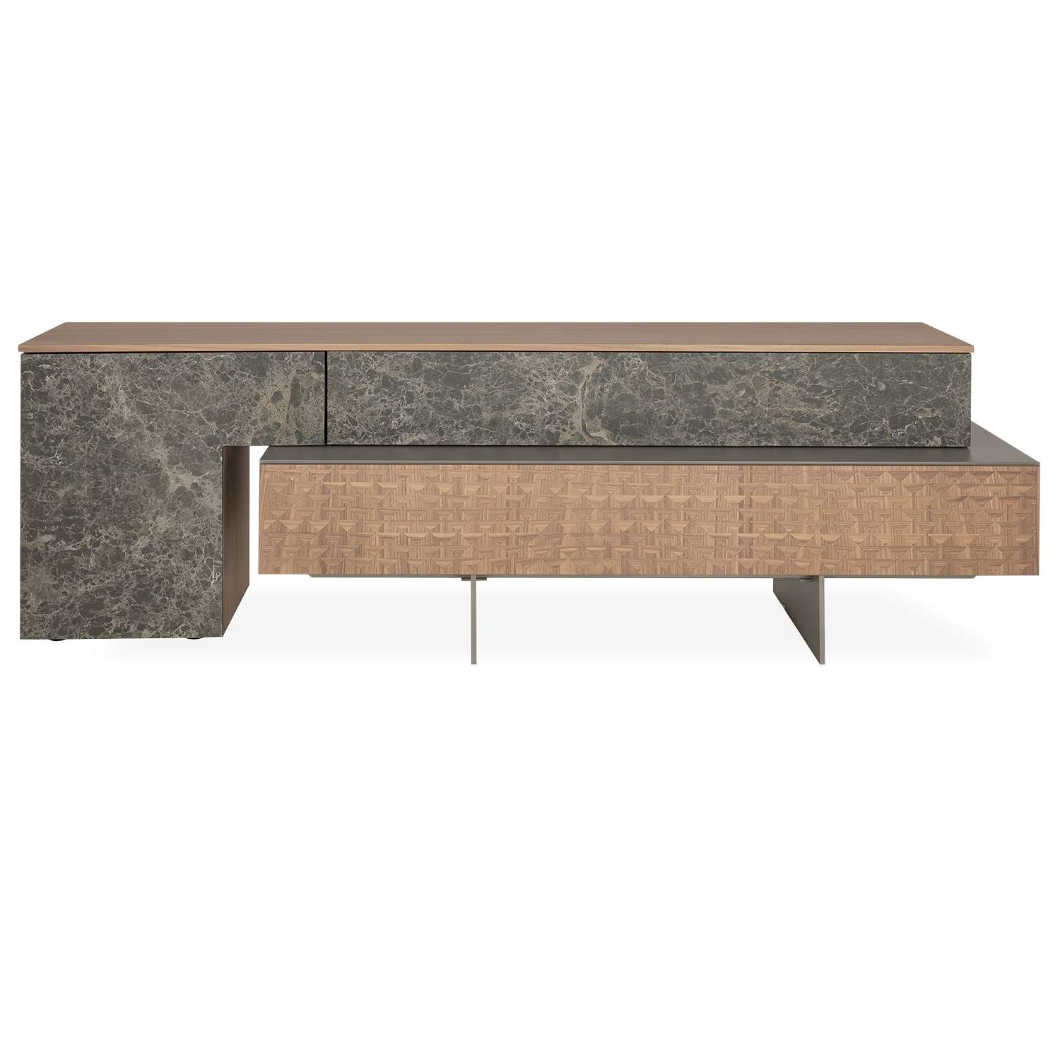 Made in Italy, the Horizon TV Bench features a bold contemporary design with an artistic blend of finishes and textures. Horizon's top unit is made of light walnut veneer with a grey Emperador ceramic marble front and push-to-open mechanisms on its doors. The leftmost cabinet has an interior storage space with an adjustable glass shelf, while the center compartment has a drop-down front that reveals two interior cubbies. Horizon's lower unit is finished in grey Cacao matte lacquer, with one spacious double drawer paneled in carved light walnut veneer. Slim metal legs in matching grey lacquer complete the look. Unique and refined, Horizon's tiered design offers the perfect amount of storage and display space.