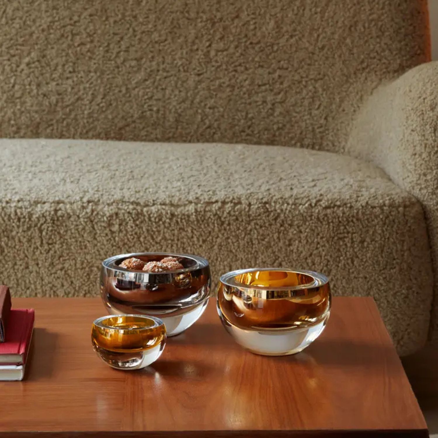 The Host Bowl has a solid, grounding presence with its curved shape, thick walls, heavy base, and flat, polished rim. Made of mouth-blown glass by master glassblowers, the Host Bowl's inside surface is painted by hand with real 24 karat gold. This food-safe bowl can be displayed as decor or used to serve nuts, olives, and other snacks.