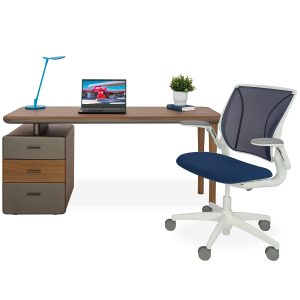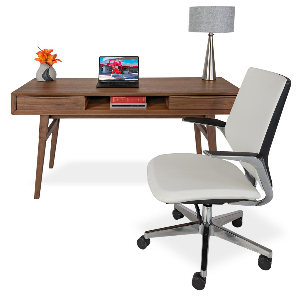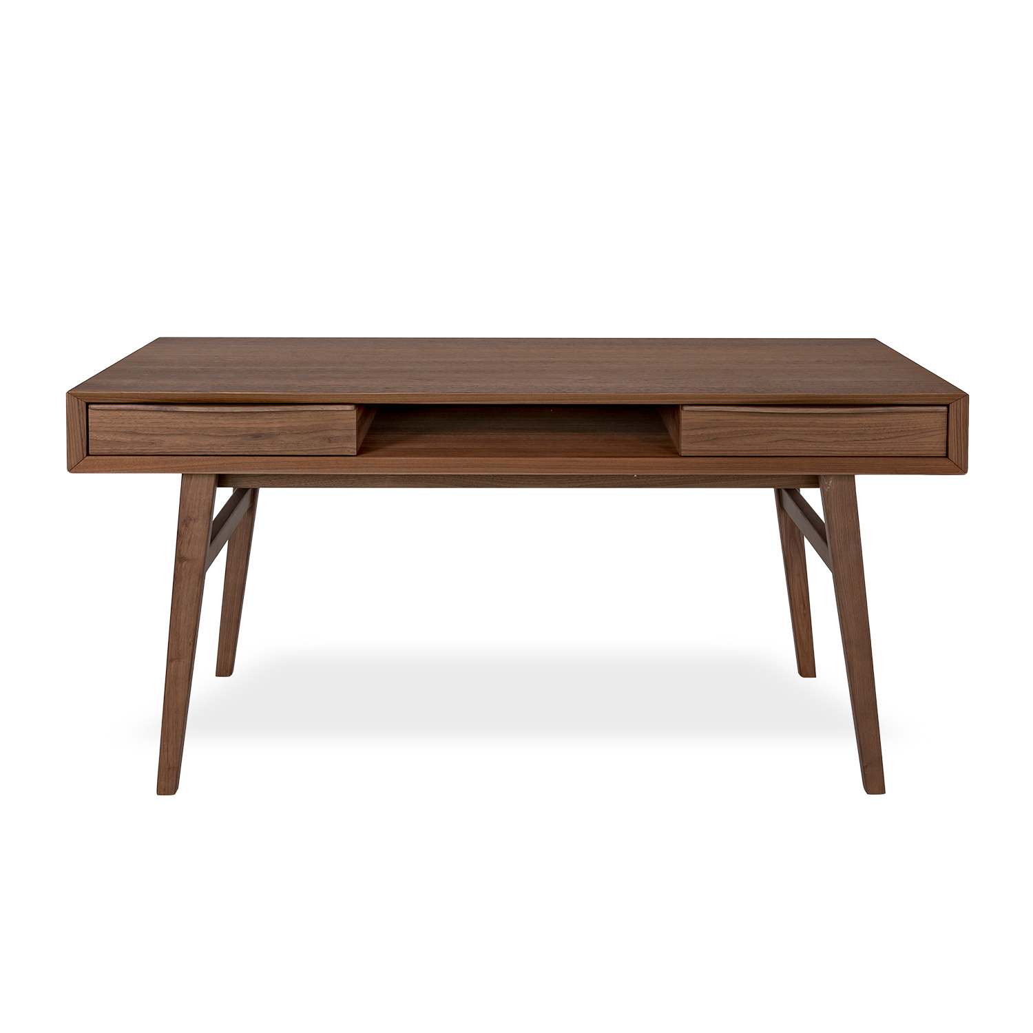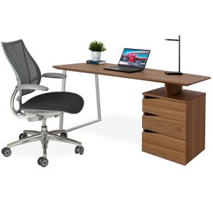 The Hudson Desk, available in walnut, has clean lines and convenient features to boost your productivity. Two drawers on either side provide convenient storage for office essentials, while the open center compartment gives you easy access to items that need to be close at hand, like a laptop, papers, or rechargeable items. With a mid-century modern-inspired design and clean silhouette, Hudson is suitable for a wide variety of aesthetic environments.