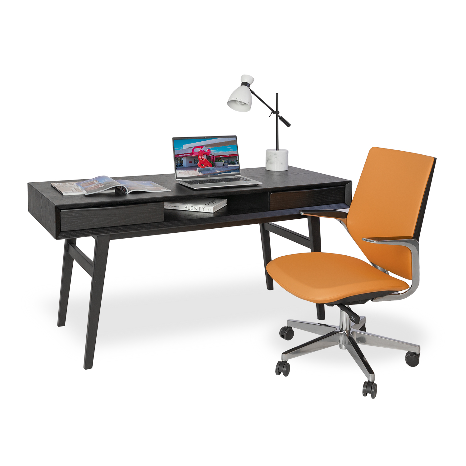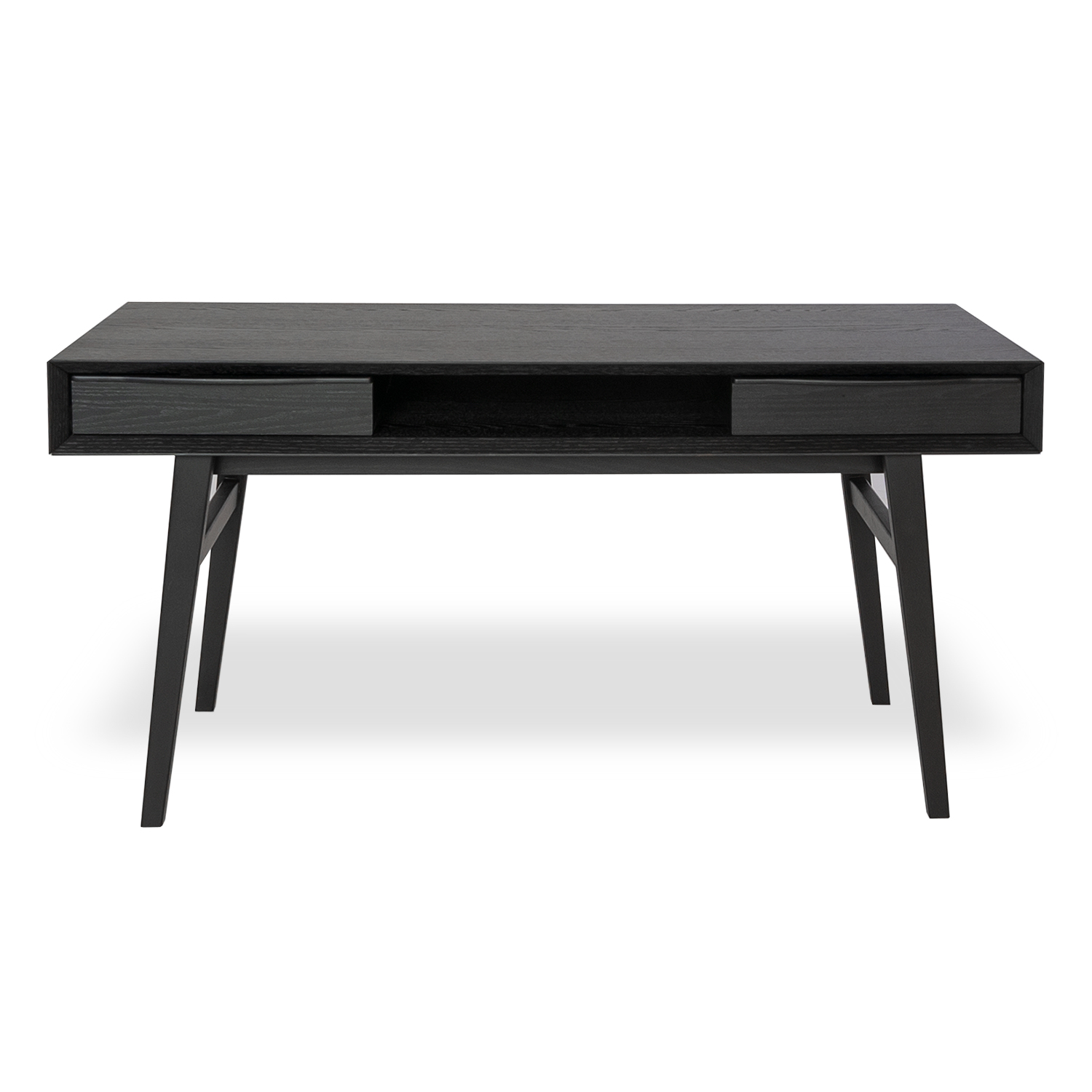 The Hudson Desk, available in black oak, has clean lines and convenient features to boost your productivity. Two drawers on either side provide convenient storage for office essentials, while the open center compartment gives you easy access to items that need to be close at hand, like a laptop, papers, or rechargeable items. With a mid-century modern-inspired design and clean silhouette, Hudson is suitable for a wide variety of aesthetic environments.