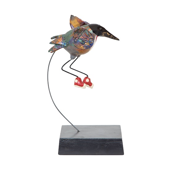 [0] => The Humming Bird sculpture, by artist Steven McGovney, has a cute and quirky personality, with a multicolored body, red and white shoes, and a dynamic mid-flight pose supported by a thin wire. Humming Bird is made of hand-built high-fire ceramic with acrylic, metallic, and oil stain finishes. Place it on your bookshelf, table, or credenza to instantly add charm to any room.
