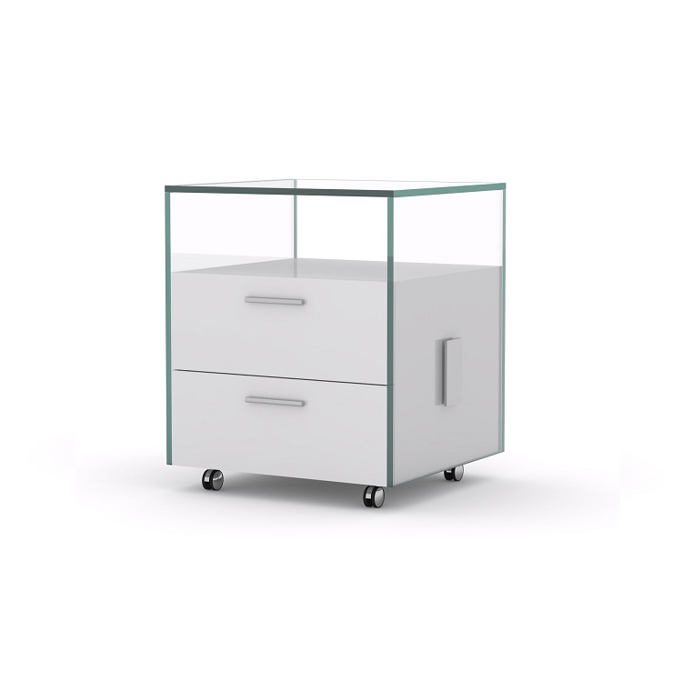 [0] => idomus white 2 drawer pedestal, tempered glass frame, high gloss white drawer fronts, polished stanless steel accents w/castors glfa