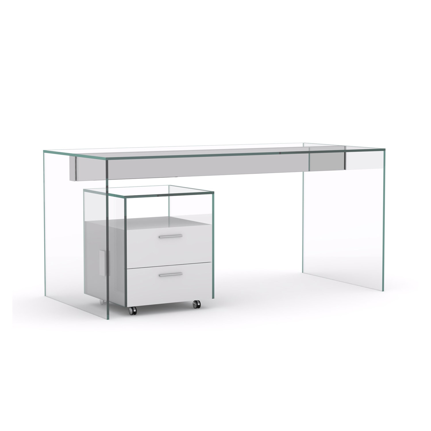 [0] => Perfect paired with the Idomus Desk, the Idomus Drawer Pedestal is available in a glossy white finish with an elegant tempered glass frame that extends over the drawer unit to create an open storage shelf below. Two drawers keep your files and papers organized, while polished steel accents add a modern touch. Castors allow for easy movement of this pedestal within your office space.