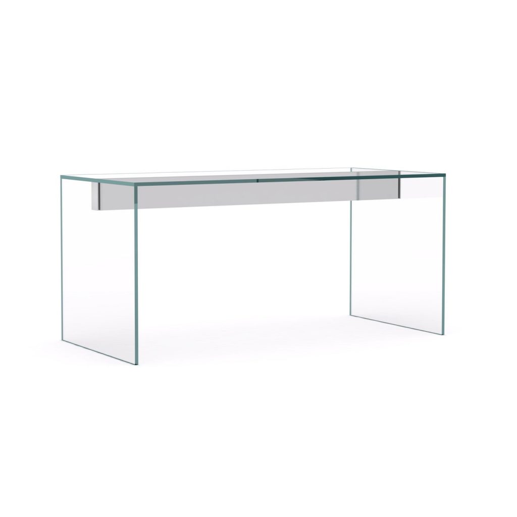 [0] => The Idomus II Desk is a marvel of contemporary design, featuring a tabletop and legs made entirely of clear glass. A polished steel support beam under the tabletop provides stability and further enhances this desk's futuristic look. The broad surface of the desk offers a roomy workspace, while its crisp, minimalist lines make Idomus II both stylish and versatile in any space. Pair with the Idomus Drawer Pedestal to take your productivity to the next level.