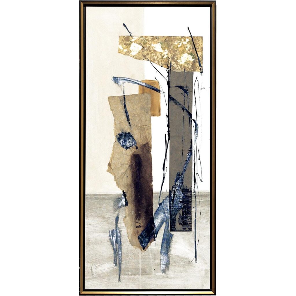 [0] => In the Swing II, by the artist Crespi, is an abstract mixed-media work that is equal parts balanced and restless. Brown, grey, and gold rectangles are arranged in two vertical formations and painted over with jagged brushstrokes of shimmering blue. A background in subtler shades of white, beige, and grey lets the foreground pop, while an included espresso frame makes this artwork ready to hang in any modern living room or office.