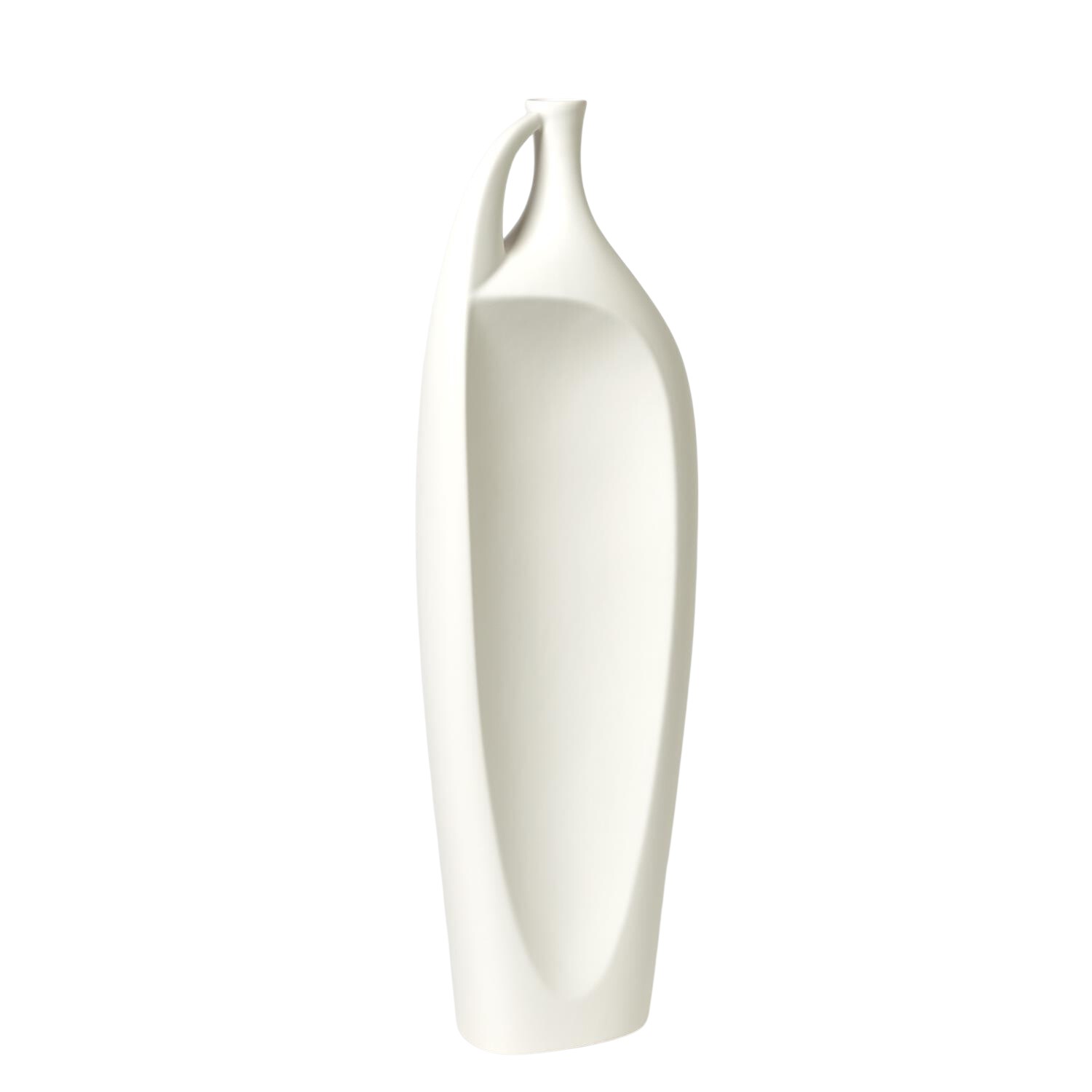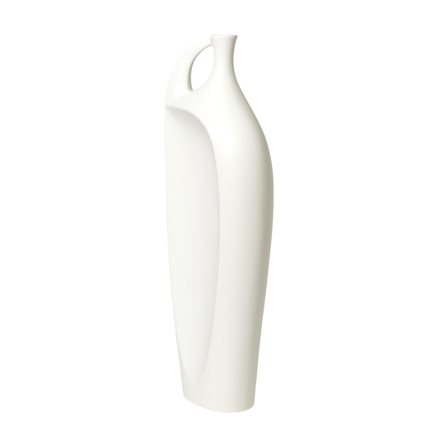 [0] => Made by hand in Portugal, the Large Indentation Vase has a matte white finish and a voluminous form that tapers to a narrow mouth with a small handle. This vase evokes the look of a classical Greek vessel with a modern twist -- one side features a long, deep indentation while the other side has a standard convex curve. While not watertight, this vase can stand on its own or be paired with its small and medium versions for a style accent that's both timeless and contemporary.