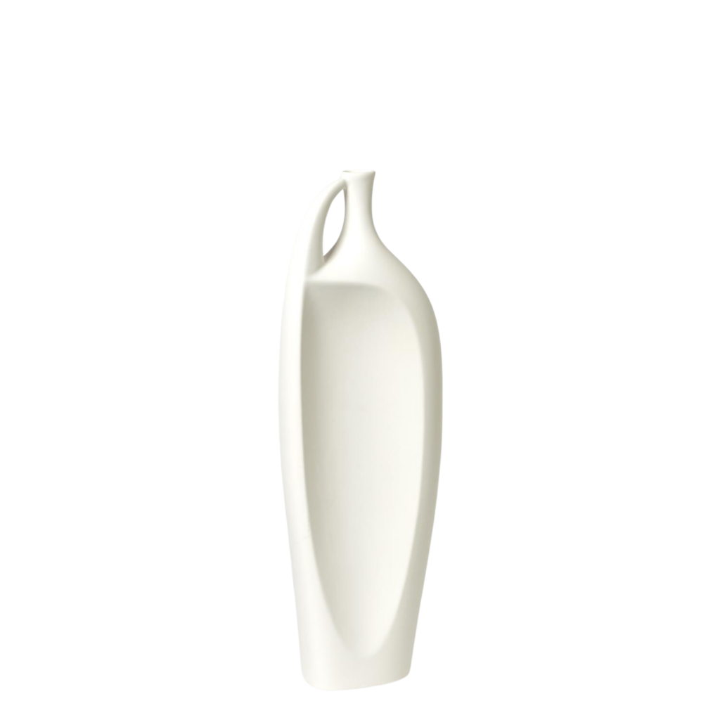 [0] => Made by hand in Portugal, the Medium Indentation Vase has a matte white finish and a voluminous form that tapers to a narrow mouth with a small handle. This vase evokes the look of a classical Greek vessel with a modern twist -- one side features a long, deep indentation while the other side has a standard convex curve. While not watertight, this vase can stand on its own or be paired with its smaller and larger versions for a style accent that's both timeless and contemporary.