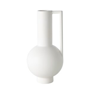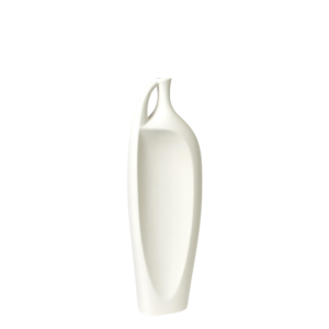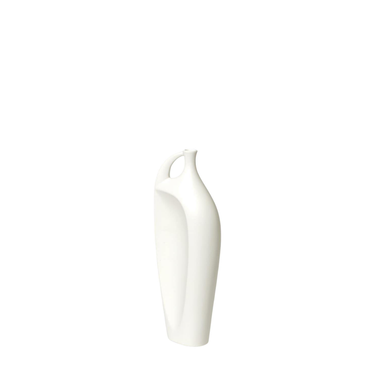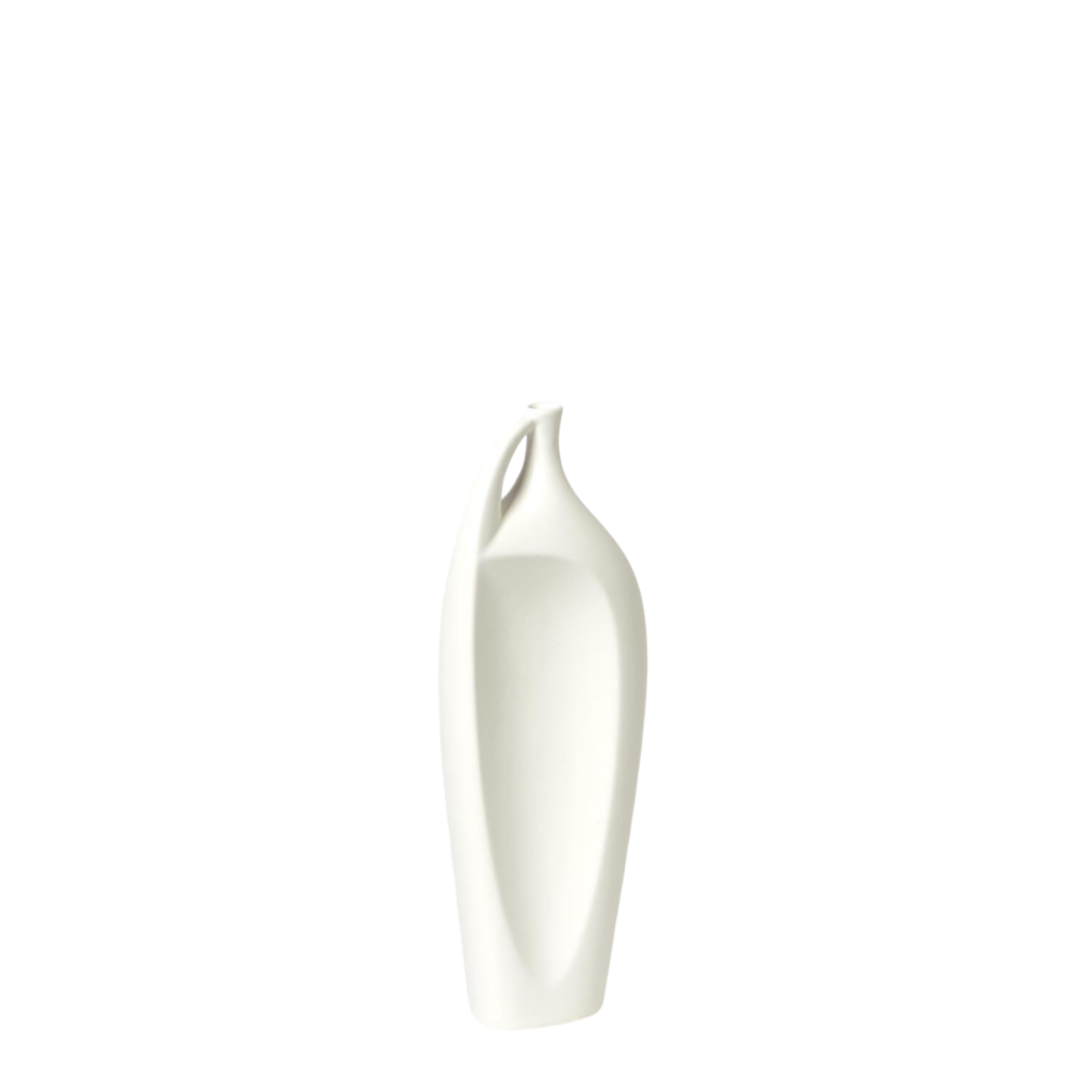 [0] => Made by hand in Portugal, the Small Indentation Vase has a matte white finish and a voluminous form that tapers to a narrow mouth with a small handle. This vase evokes the look of a classical Greek vessel with a modern twist -- one side features a long, deep indentation while the other side has a standard convex curve. While not watertight, this vase can stand on its own or be paired with its medium and large versions for a style accent that's both timeless and contemporary.
