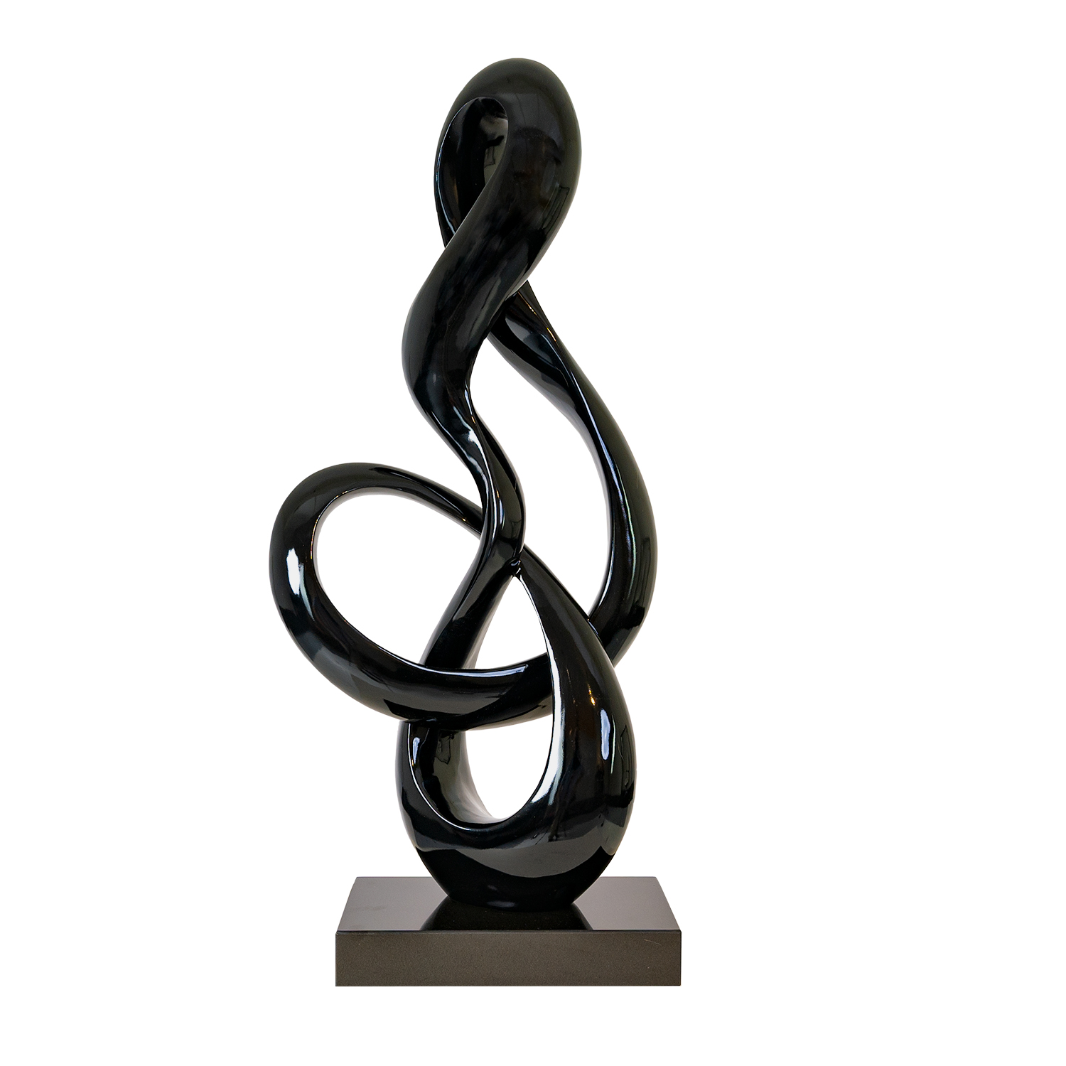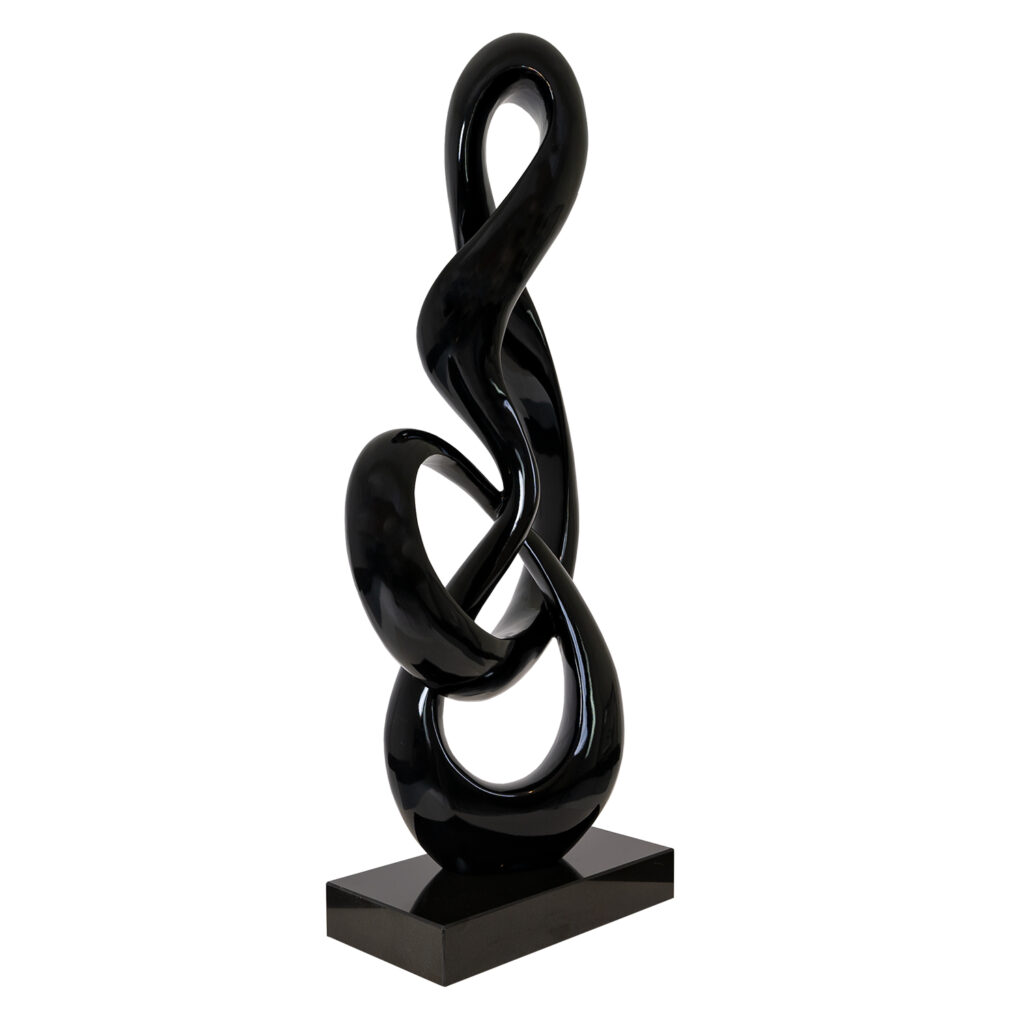 [0] => The Black Interlocking Sculpture depicts a fluid, abstract form full of curves and loops that cross over and under each other for a free-flowing yet harmonious composition. Crafted from resin, this sculpture rests on a rectangular grey base that lets it stand stably on a sideboard, table, desk, or floor.