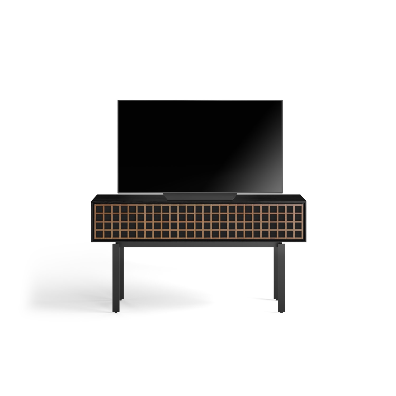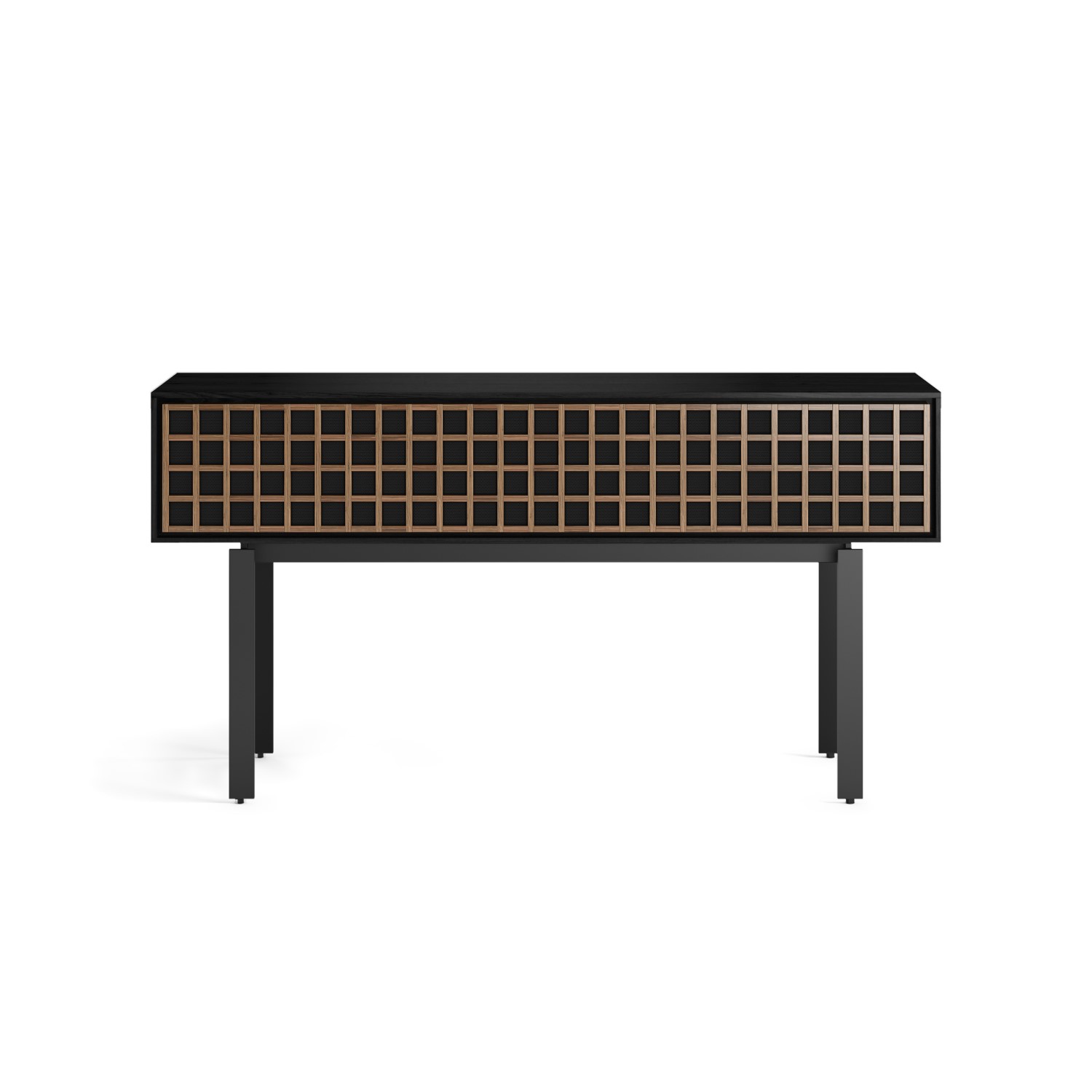 The Interval Console by BDI merges form and function in one innovative, user-friendly design, integrating technology with style. Made from a combination of ebonized ash and natural walnut, this piece features a push-to-open door that provides flow-through ventilation and acoustic transparency, and an interior structure that includes cable management, an adjustable shelf, sound bar shelf, cable glide systems, and a fixed rear panel. The door is composed of half-lap jointed hardwood backed with a fabric-covered perforated metal that is visually striking, while the powder-coated steel legs feature adjustable levelers for setting up Interval perfectly on any surface.
