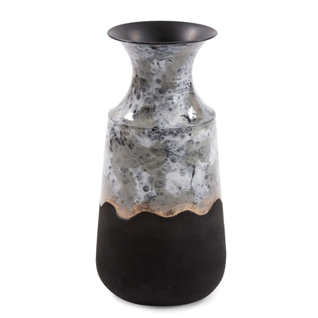[0] => The Iron Flared Medium Vase features a classic shape and a contemporary glossy grey, black, and white marble finish that transitions into a textured matte black. A thin gold border separates the two, adding a hint of color and a flame-like effect. The Iron Flared Vase can stand on its own as a piece of art and is a sophisticated way to display fresh or artificial flowers in your home.